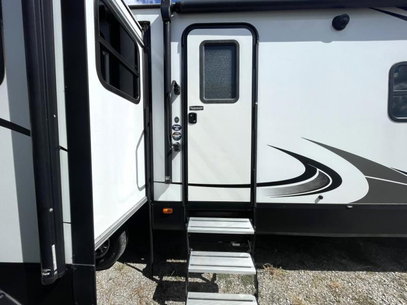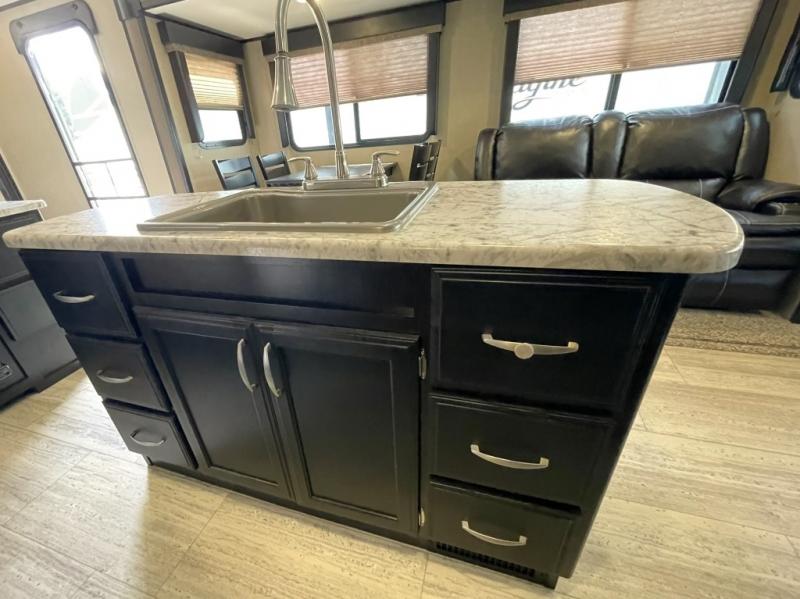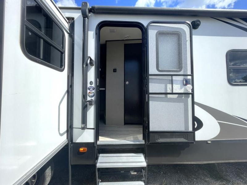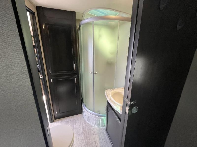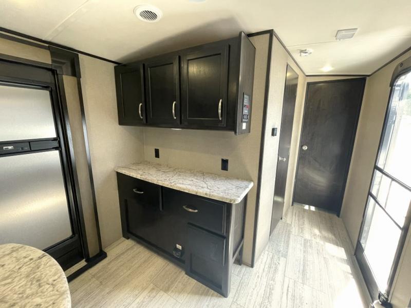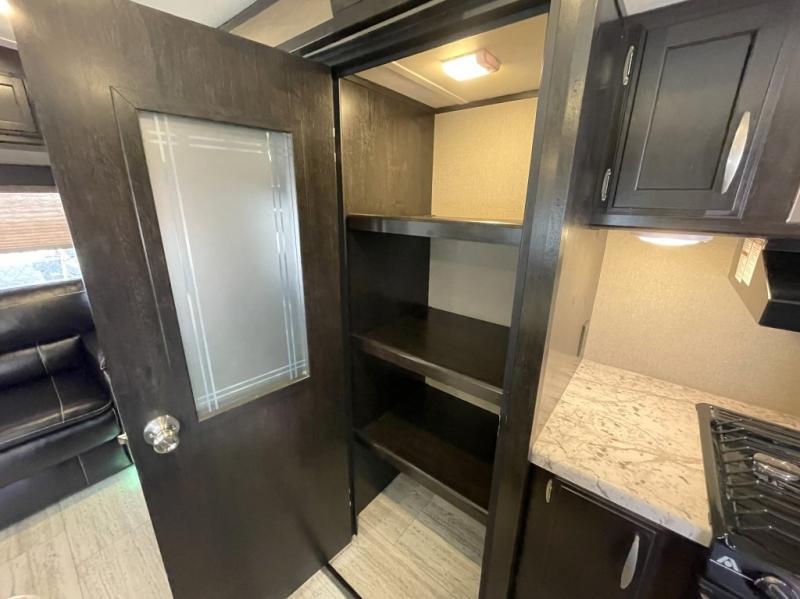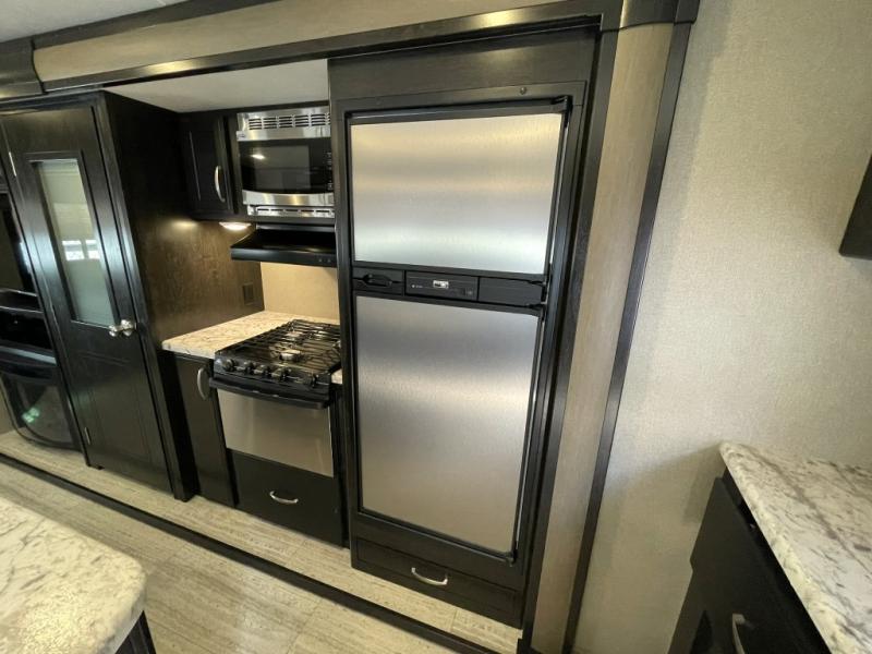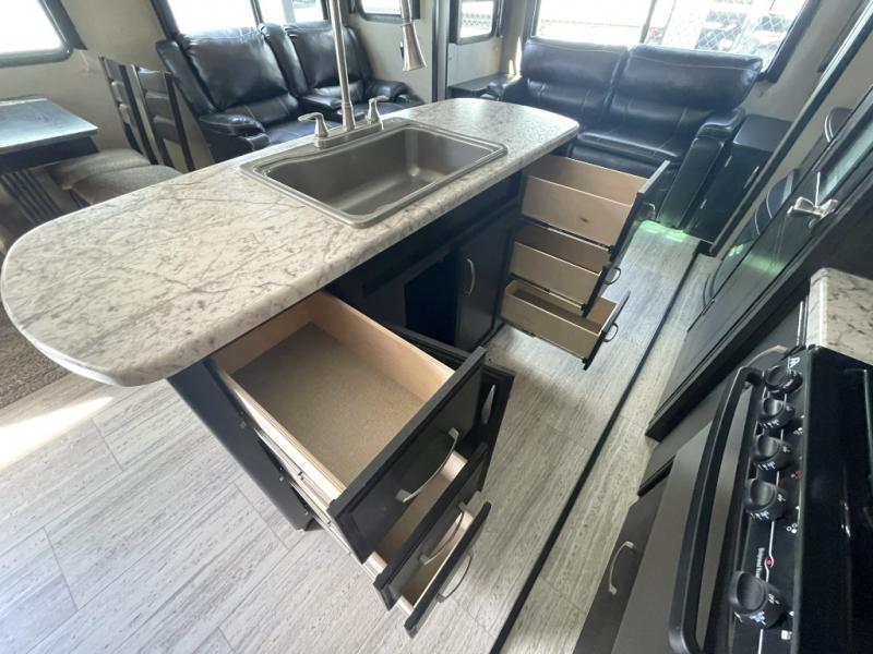 You’ll appreciate the drop-frame pass-through storage outside, which provides ample space for all your camping gear. Inside, you’ll find overhead cabinets, pantry storage, a linen closet, wardrobes, and more to keep everything organized and easy to access.
