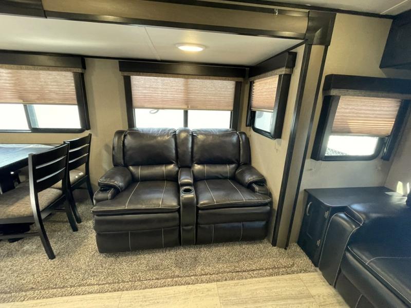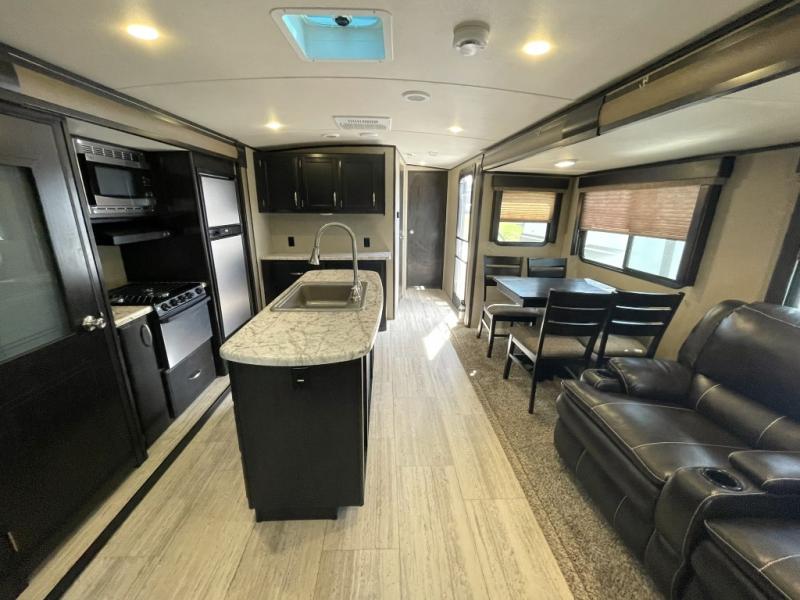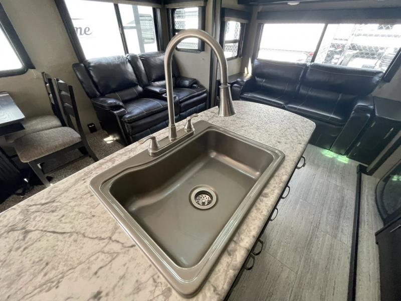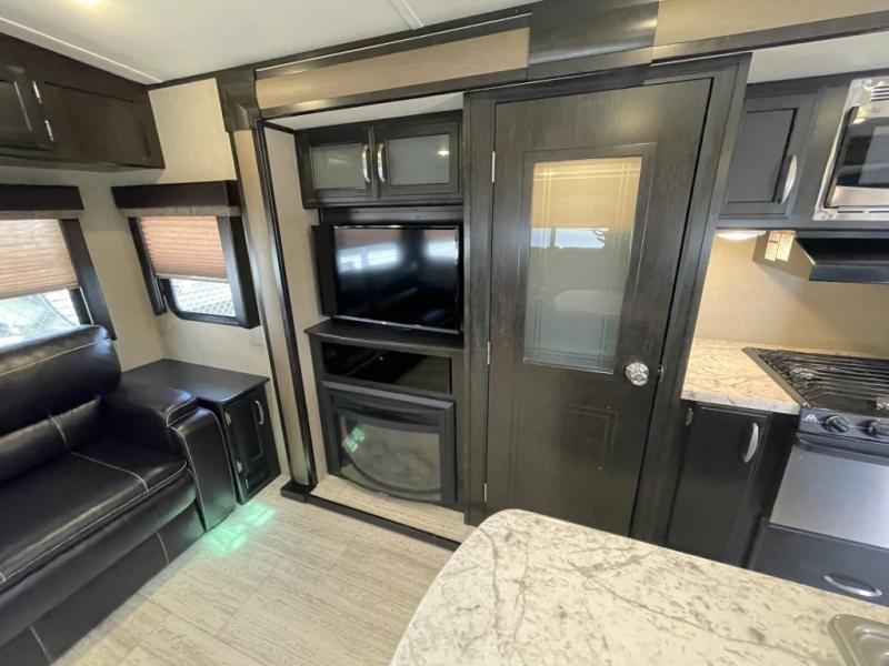 Step inside and immediately feel the open, airy design of this smartly laid-out travel trailer. The rear tri-fold sofa offers extra seating and converts into a bed for guests, while the theater seating with cup holders provides the perfect spot to relax and watch your favorite movie on the 40" LED TV with a cozy fireplace below.
