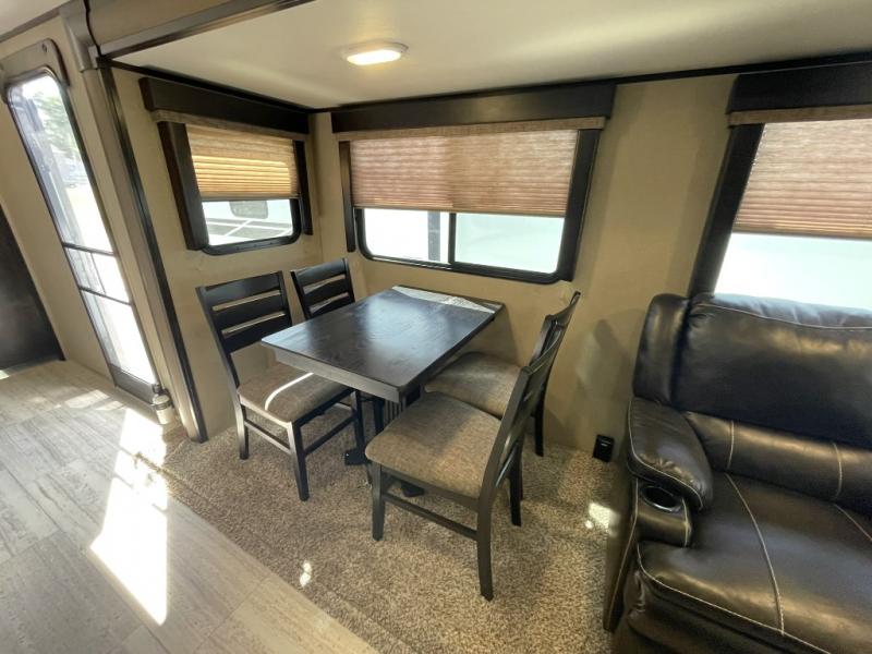 The large slide-out includes either a booth dinette or optional free-standing table and chairs, perfect for meals, game nights, or extra sleeping space. Combined with the rear and side seating, you have a full living room on wheels—ideal for entertaining or relaxing after a day outdoors.