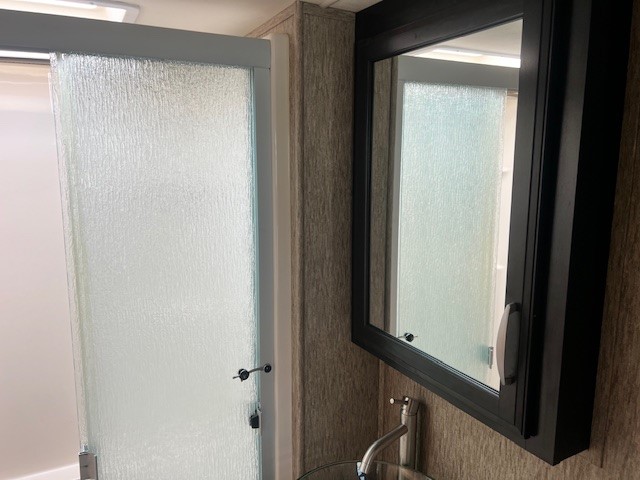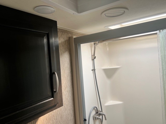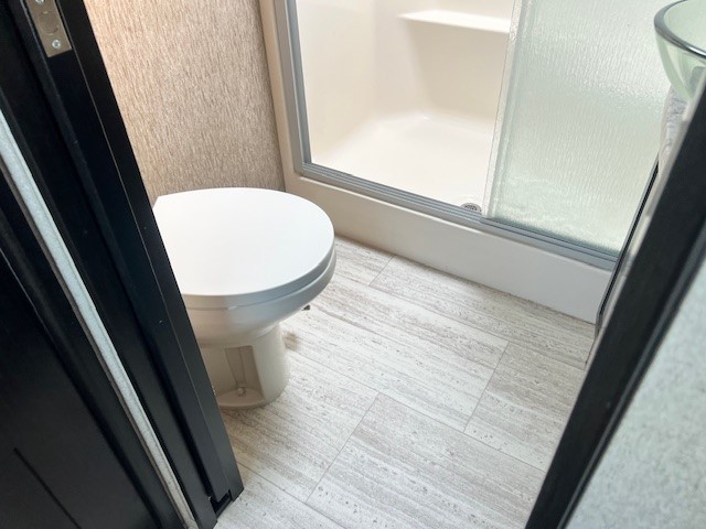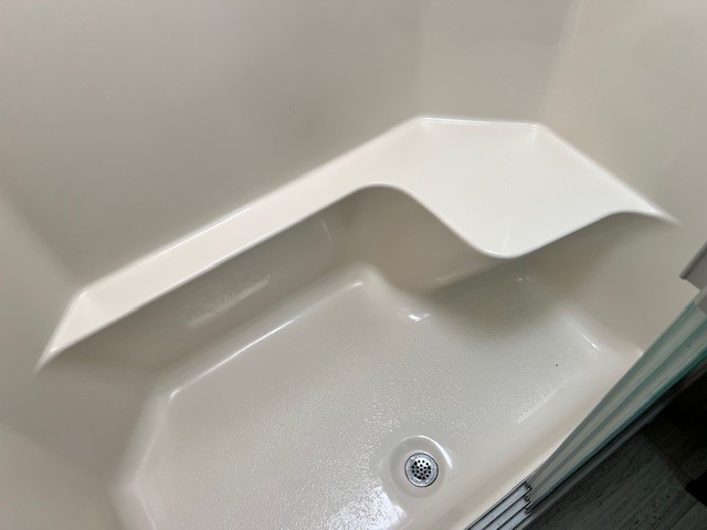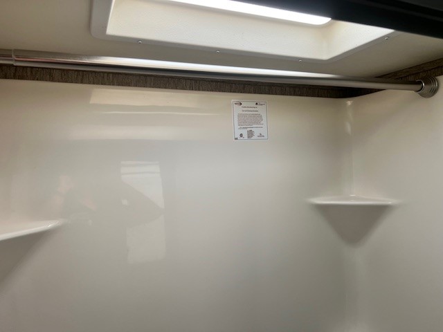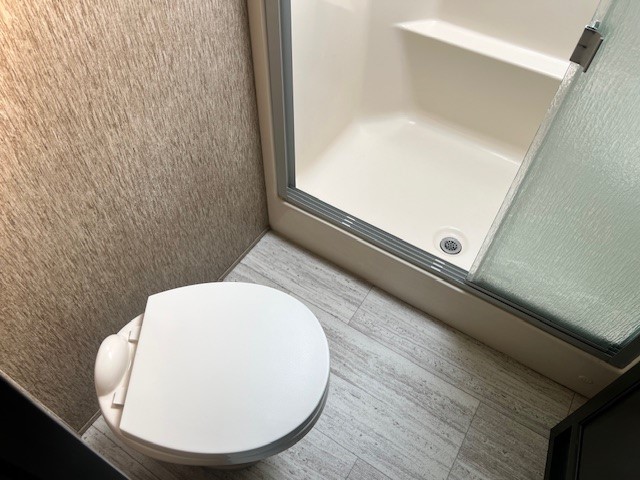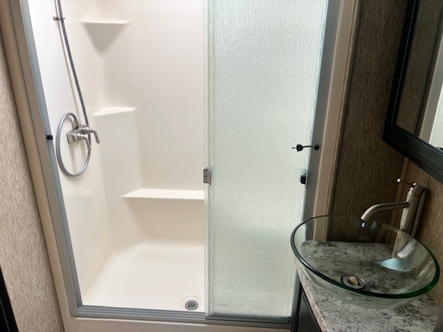 A complete bath is found in the hallway between the bedroom and kitchen area. Inside there is a shower with skylight and seat, toilet, and a vanity with vessel sink plus overhead storage.