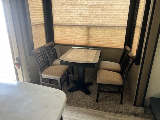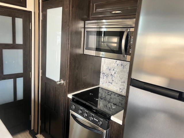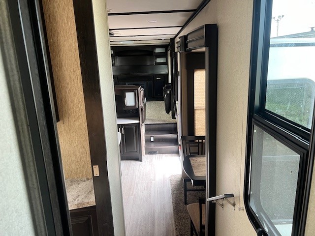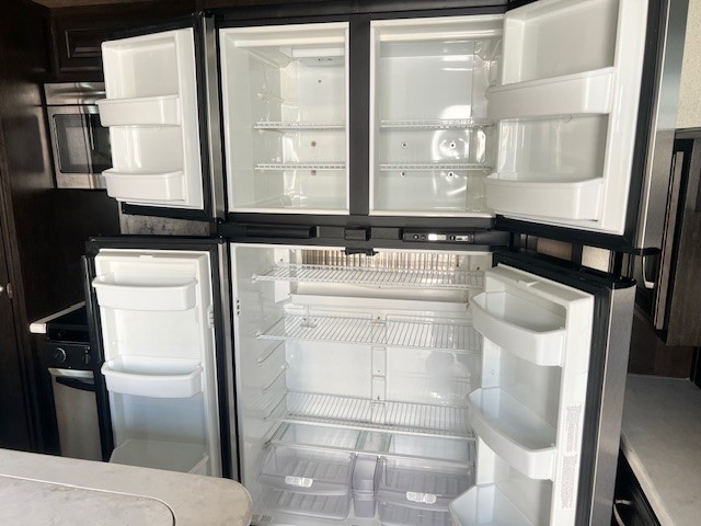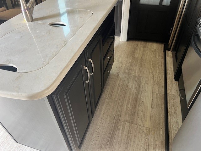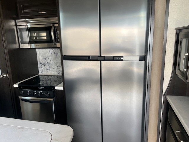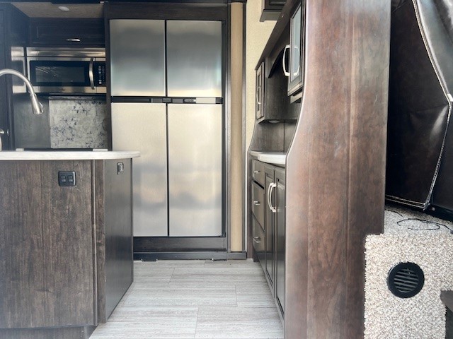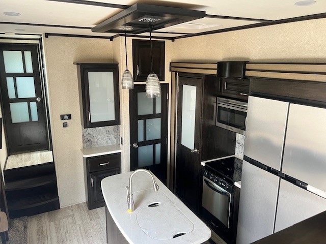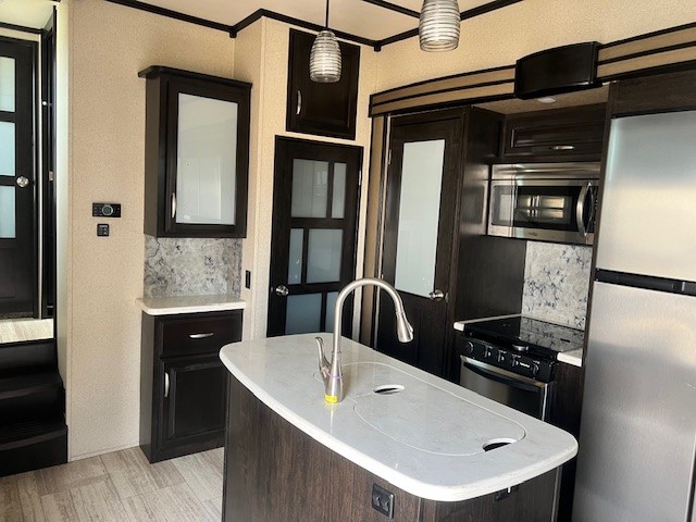 Step down just outside the bathroom into a spacious kitchen and dining area featuring dual opposing slides. There is a free standing dinette found in the curb side slide out. Opposite a second slide features a pantry, a three burner range with overhead microwave oven, and an 18 cu. ft. refrigerator. Adjacent to the pantry find a space that has been prepped for a washer and dryer if you choose to add the appliances. A hutch with more counter space and overhead storage is located along the interior wall just inside the main side entry door. Plus a convenient kitchen island also features a double sink for easy clean up, and more.