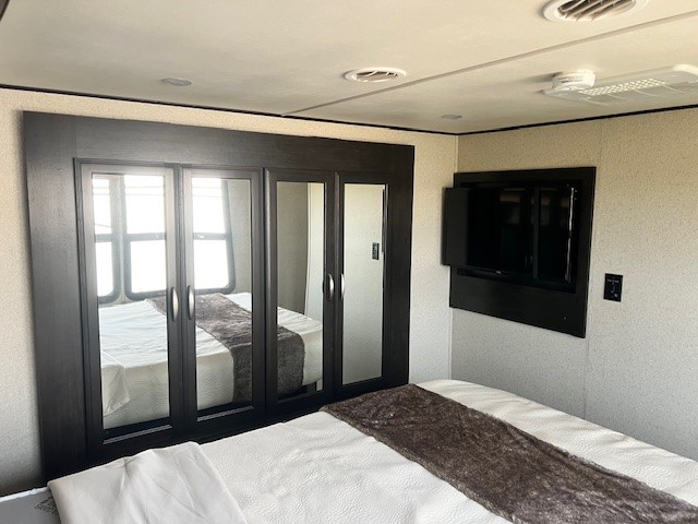 Up above the garage space you will find a master bedroom where you can rest up after a fun filled day. Enjoy a great night's sleep on a queen size bed with nightstands on either side, plus overhead cabinets. You will find plenty of storage space for your clothing in the slide out with dual closets and drawers along the road side, plus there is also a LED TV for your enjoyment.