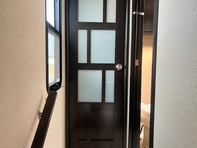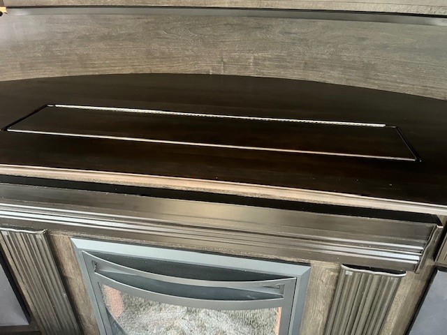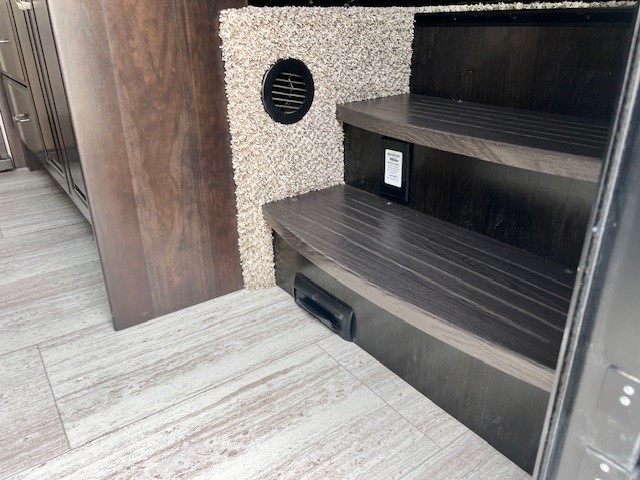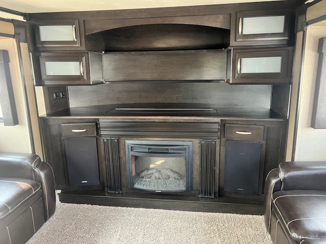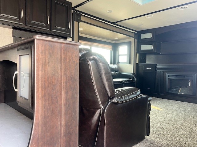 Head up the steps to the raised front living and entertainment area. There is a theater seat for two along the inside wall, or you can choose optional lounge chairs instead. Both slides in front feature a tri-fold sofa which allows for plenty of seating during daytime hours and sleeping when you entertain overnight guests. The front wall offers a telescoping TV with fireplace and overhead cabinets making this a great space to enjoy the company of your family and friends!