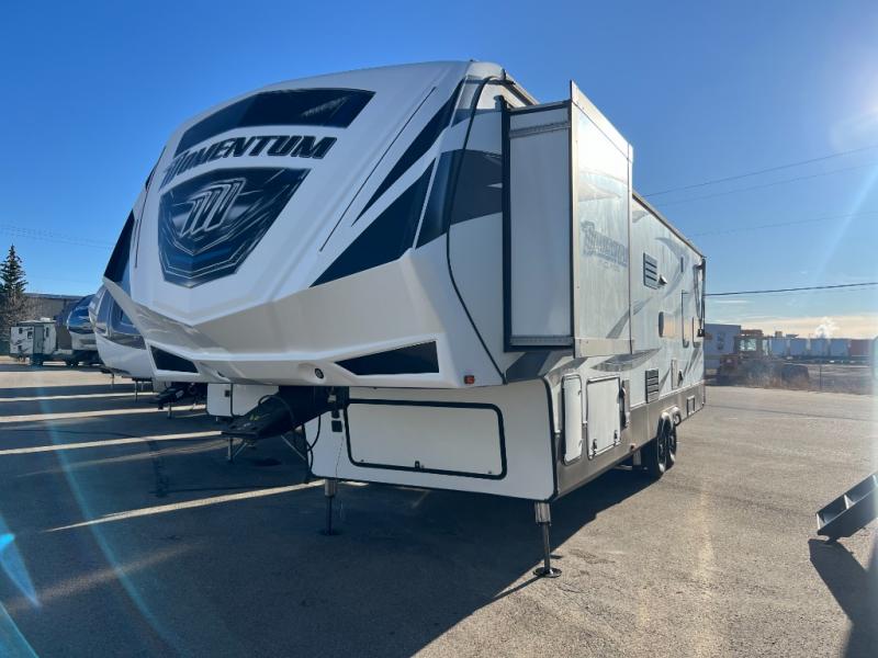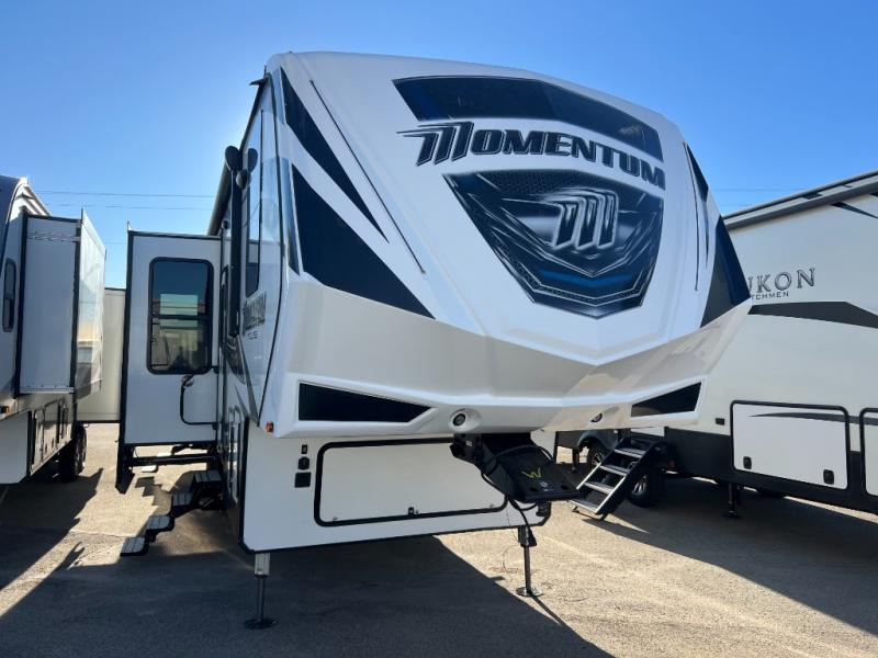 This M-Class Momentum toy hauler fifth wheel by Grand Design features a 10' cargo toy parking garage, a spacious living area that is convenient and comfortable, and a private front bedroom, plus more!