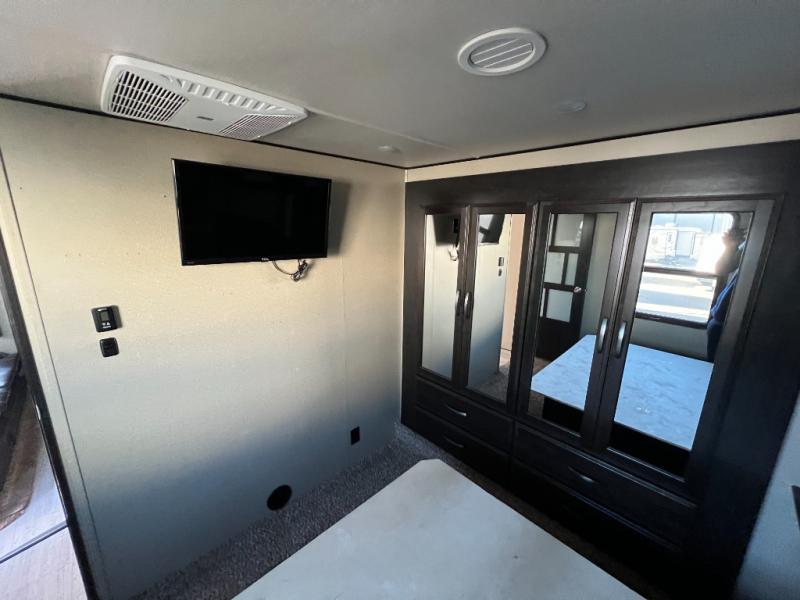The private front bedroom is away from the main living space to give you a quiet retreat that includes a queen size bed or optional king, with nightstands on both sides of the bed. There is also overhead cabinets, and a slide out wardrobe with drawers for all of your clothing.