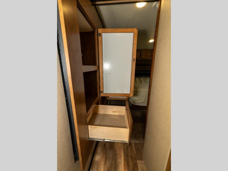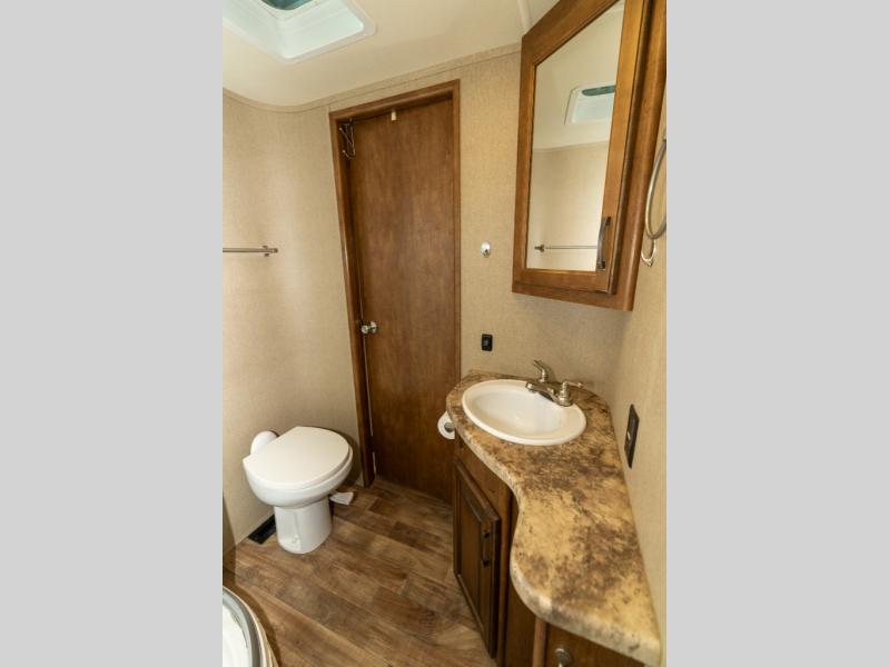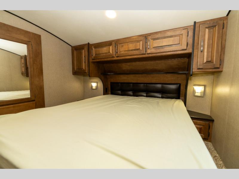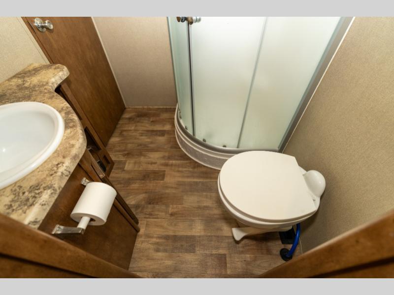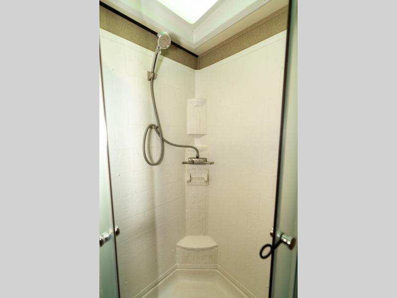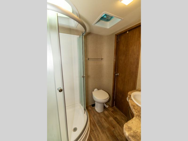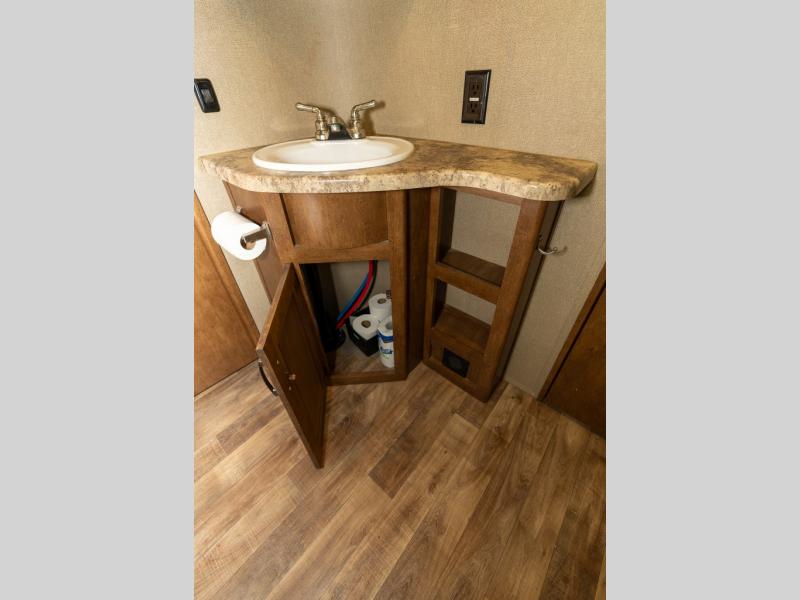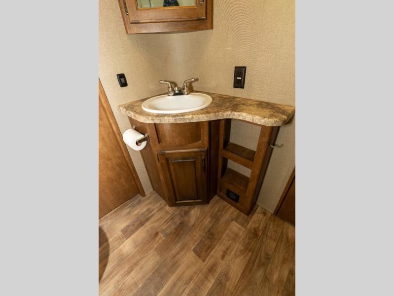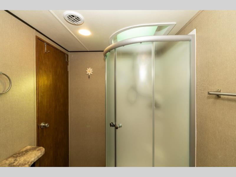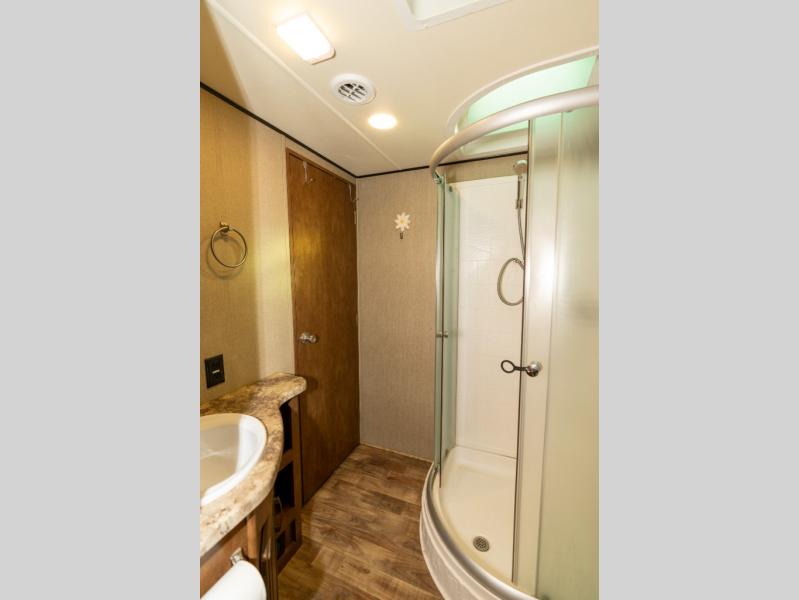 Head up the steps towards the front of the fifth wheel to a side aisle bath on your right. The bathroom includes a radius shower including a skylight, toilet, and a vanity with sink. The bath also features a second entry door that slides open to allow access into the master bedroom. There is also access to a linen cabinet with drawer in the hallway within the bedroom slide out.