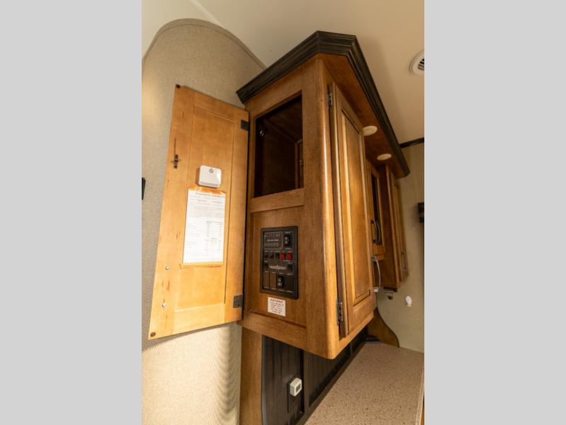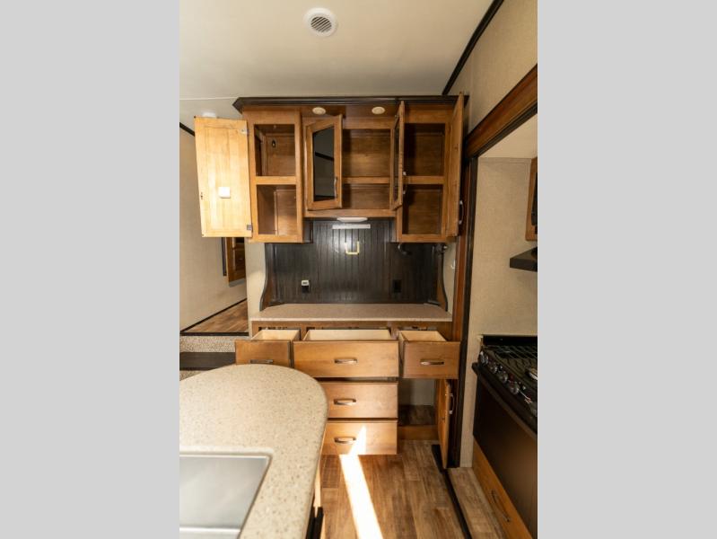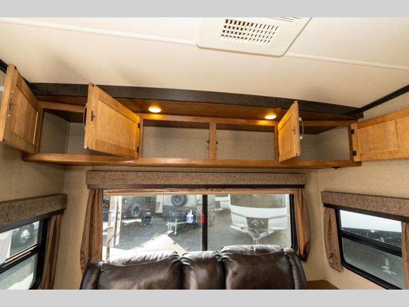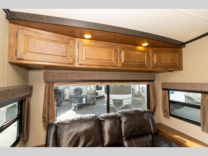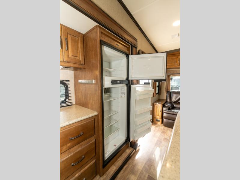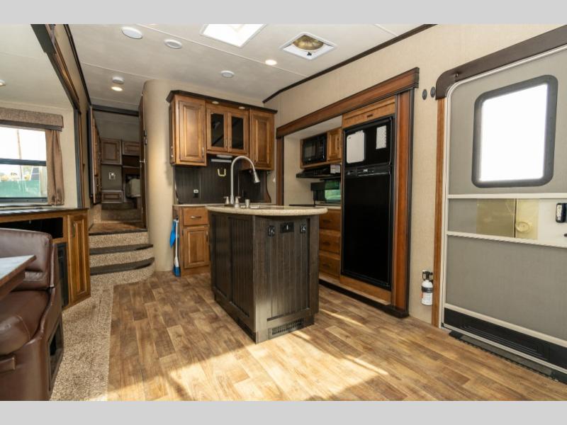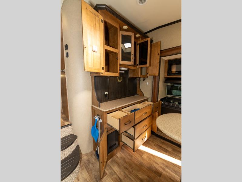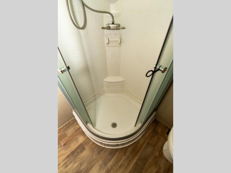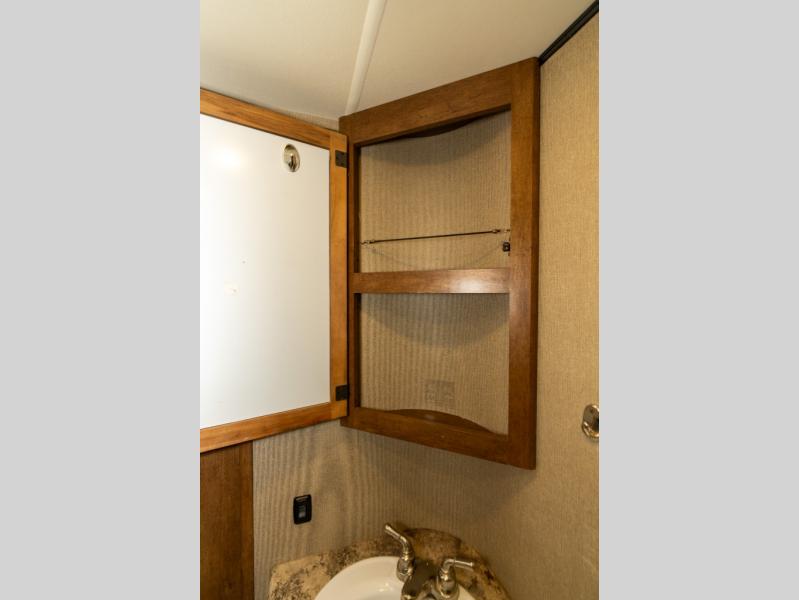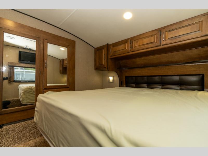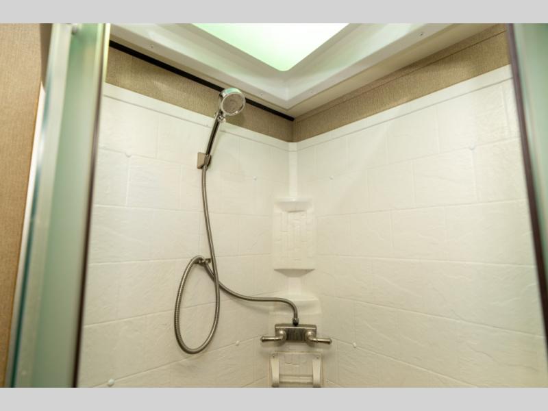 Head up the steps towards the front of the fifth wheel to a side aisle bath on your right. The bathroom includes a radius shower including a skylight, toilet, and a vanity with sink. The bath also features a second entry door that slides open to allow access into the master bedroom. There is also access to a linen cabinet with drawer in the hallway within the bedroom slide out.