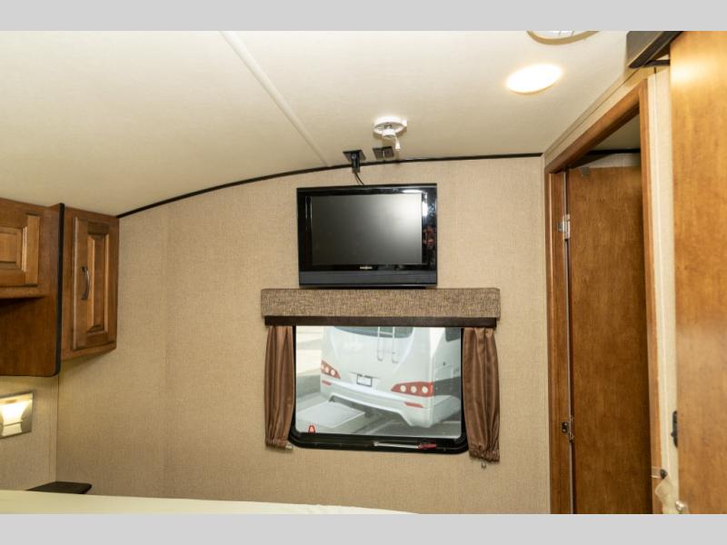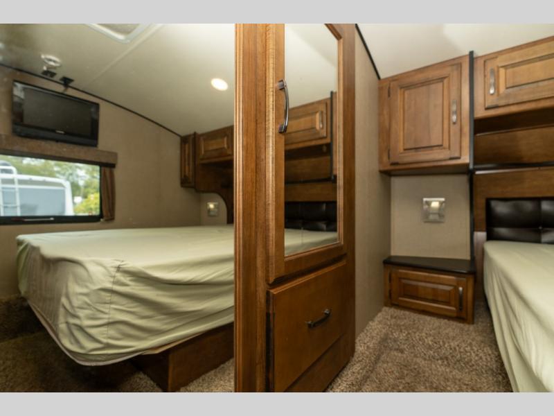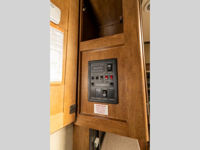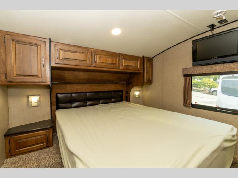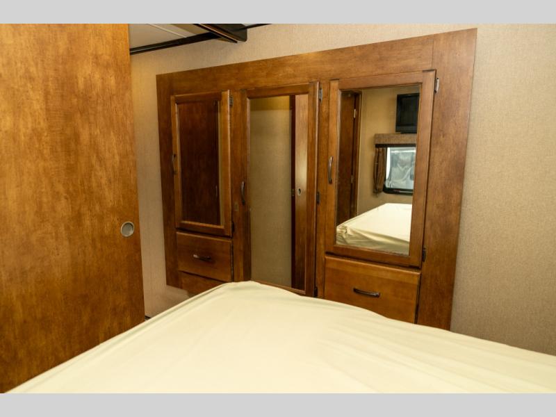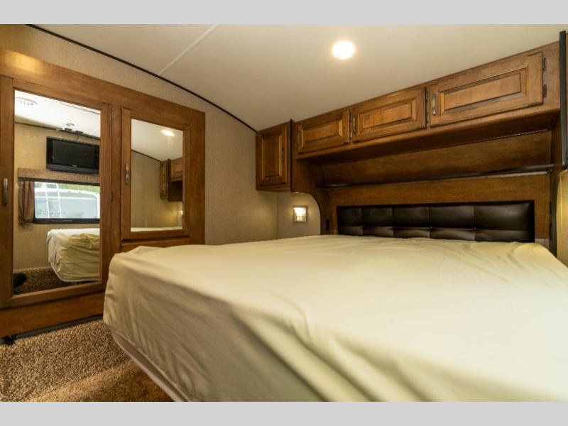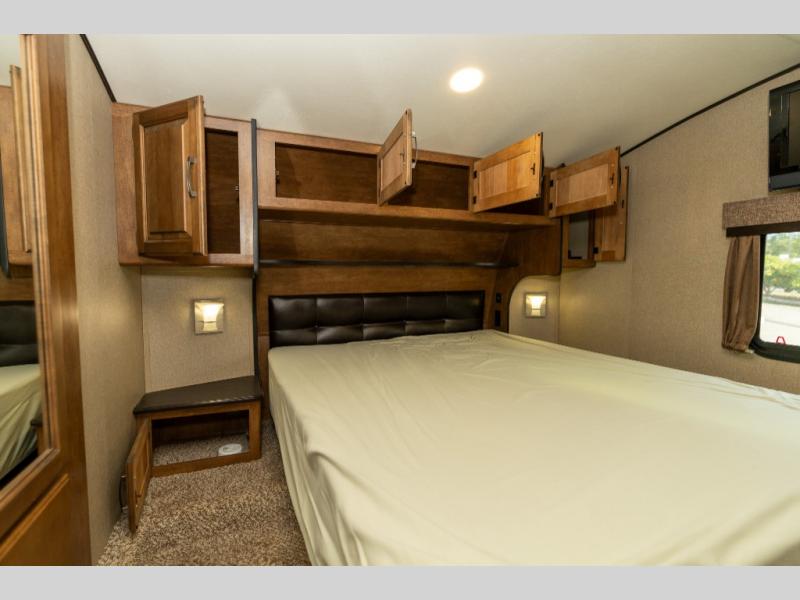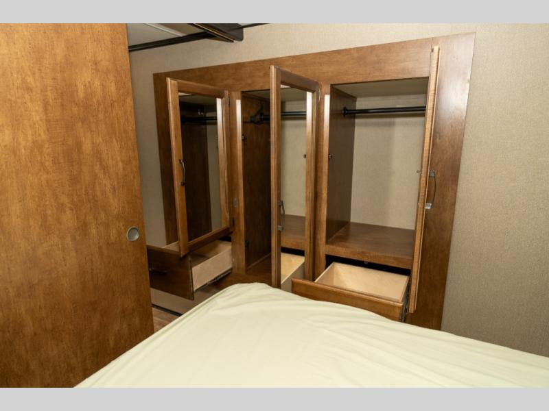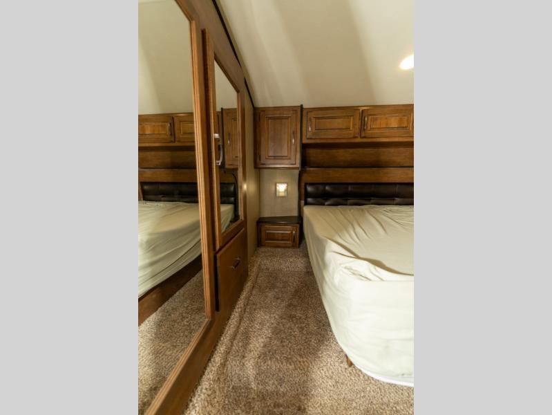 The private front bedroom can be entered from the hallway door, or through the sliding door in the bathroom. In the bedroom find a queen bed with overhead cabinets, bedside nightstands, and a slide out double wardrobe that also contains the hallway linen cabinet.