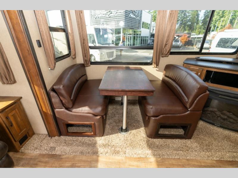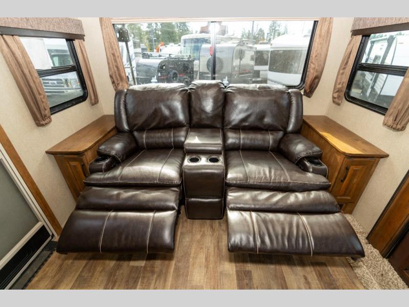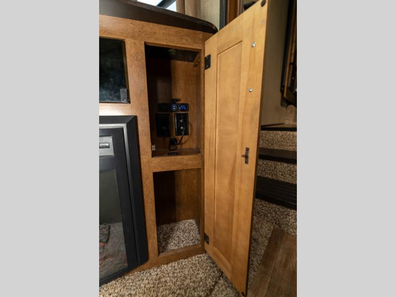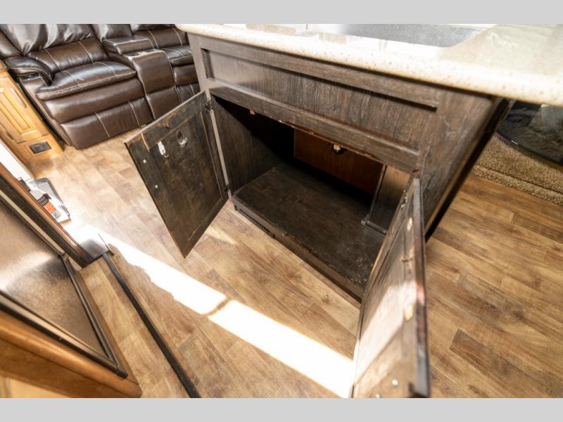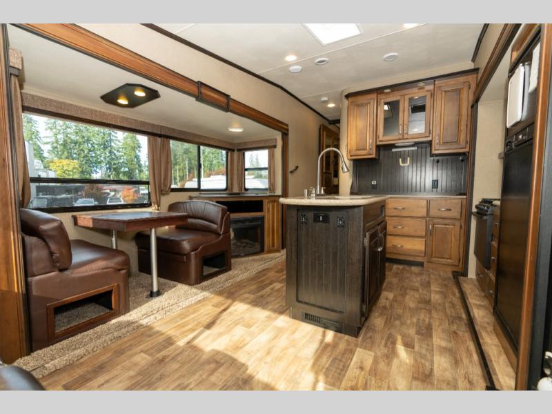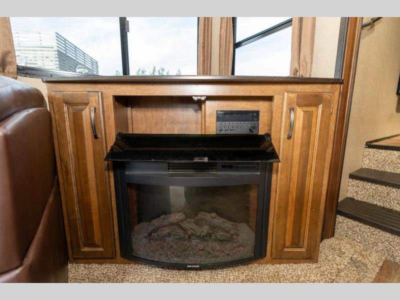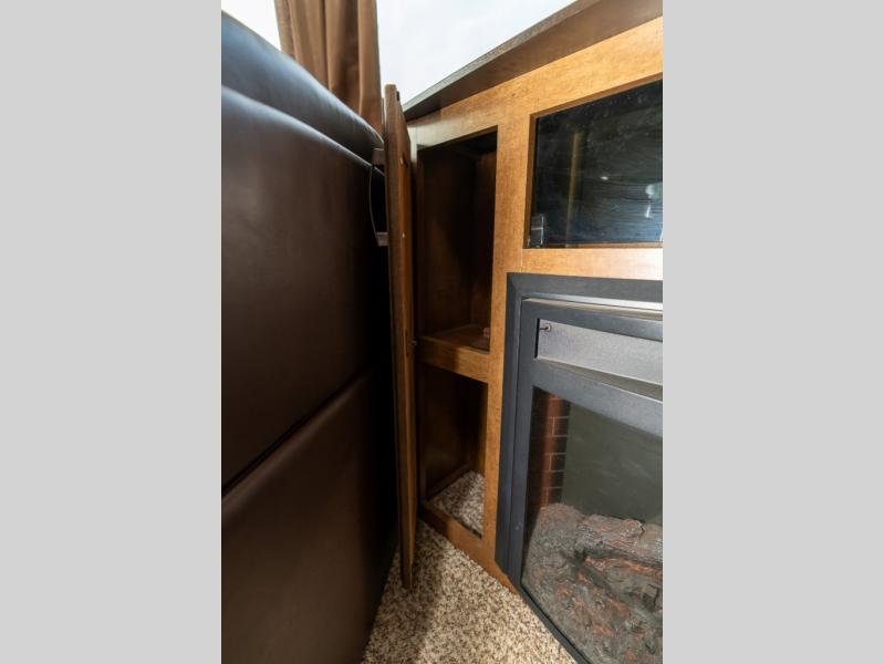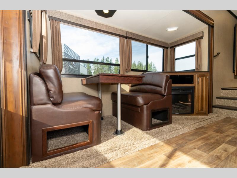 Step inside to the spaciousness with dual opposing slide outs on either side of the unit. To your left is the rear wall with theatre seating and end tables, or optional tri-fold sofa. The first slide features a free standing dinette along with a 40" telescoping LED TV, entertainment center and fireplace.