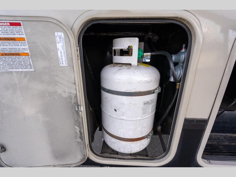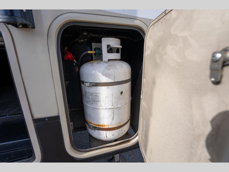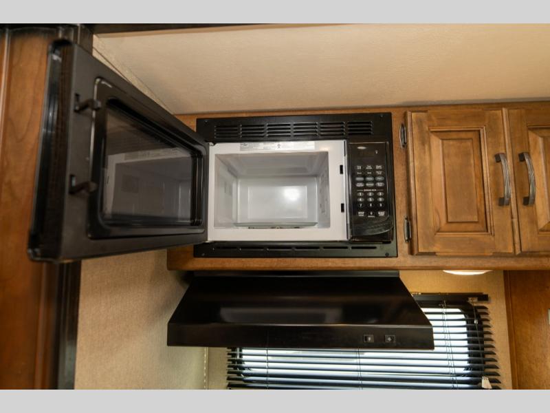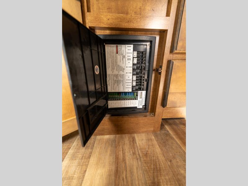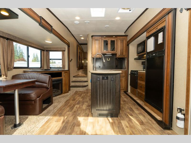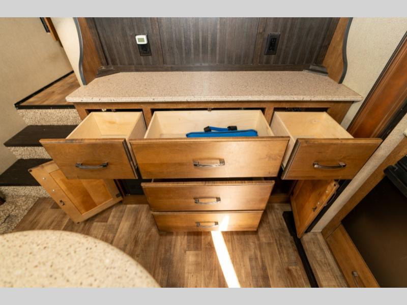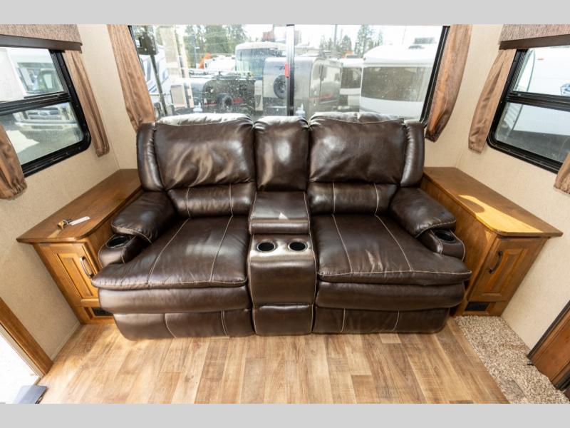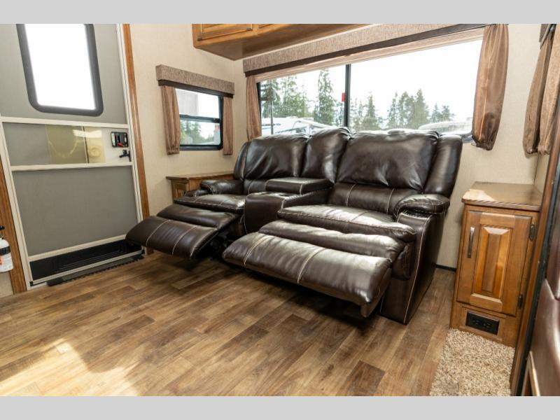 Step inside to the spaciousness with dual opposing slide outs on either side of the unit. To your left is the rear wall with theatre seating and end tables, or optional tri-fold sofa. The first slide features a free standing dinette along with a 40" telescoping LED TV, entertainment center and fireplace.