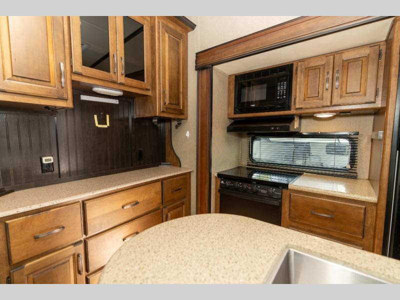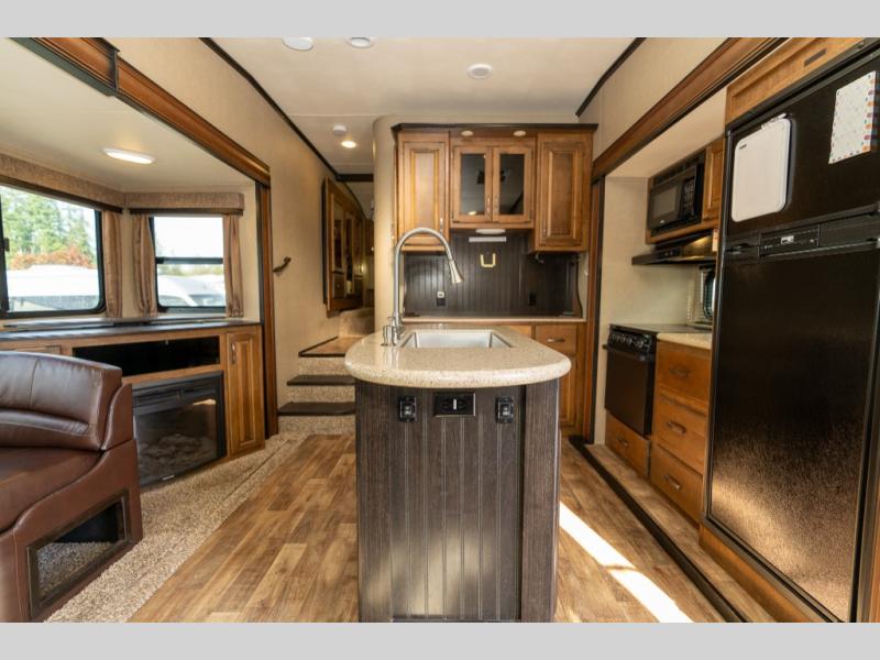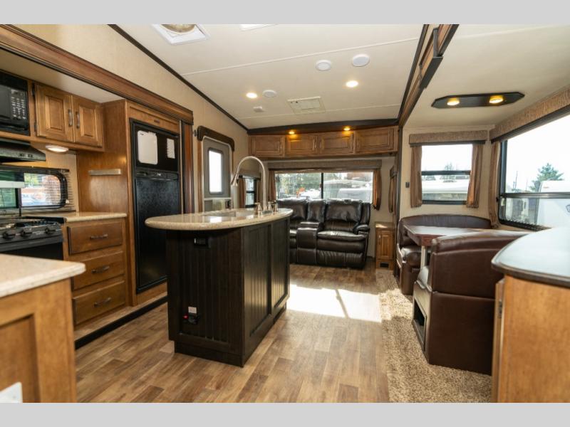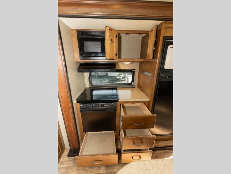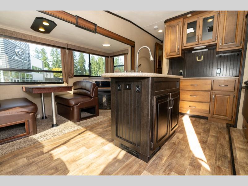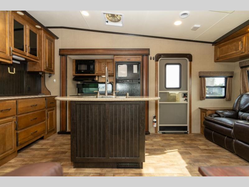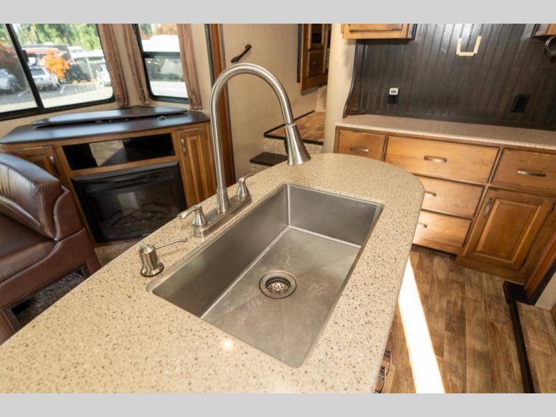 The second slide out along the curb side wall includes a refrigerator, and three burner range with convection microwave plus overhead storage for your dishes and things. Along the interior wall find a countertop for preparing or serving meals with additional overhead storage, plus lower cupboards and drawer space. A much desired kitchen island includes a large single sink, extra counter space and storage.