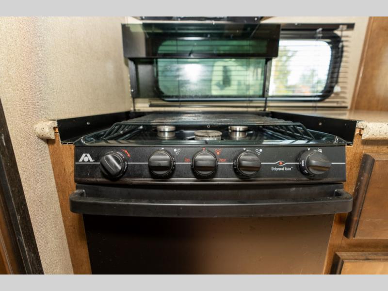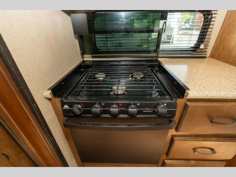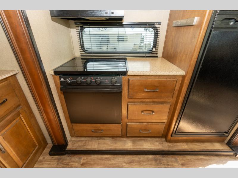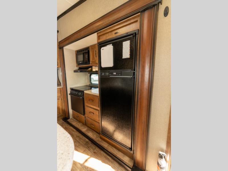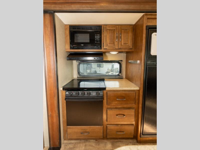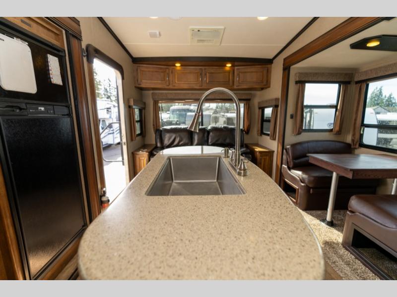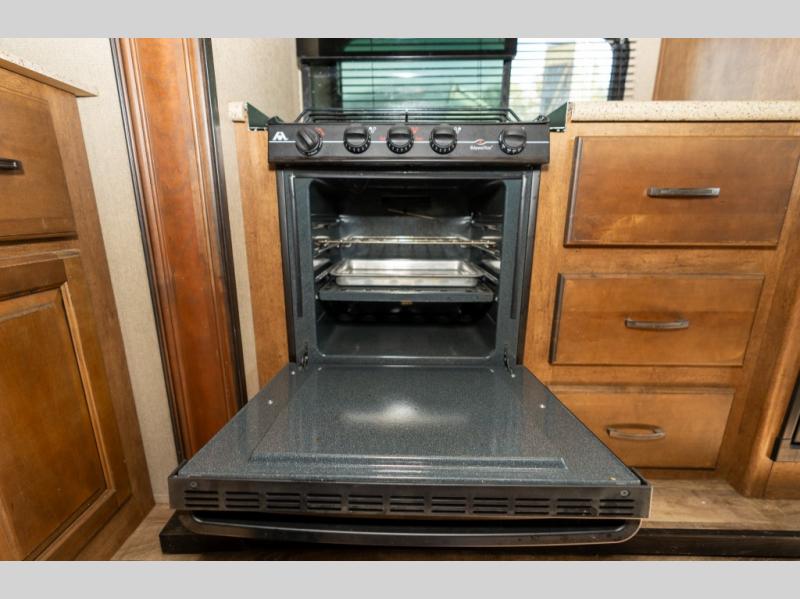 The second slide out along the curb side wall includes a refrigerator, and three burner range with convection microwave plus overhead storage for your dishes and things. Along the interior wall find a countertop for preparing or serving meals with additional overhead storage, plus lower cupboards and drawer space. A much desired kitchen island includes a large single sink, extra counter space and storage.