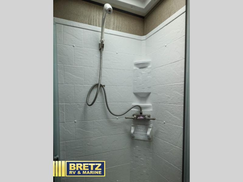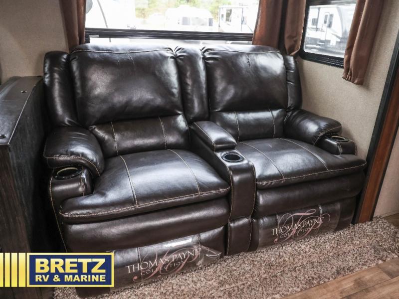 A generous exterior unobstructed pass-through storage compartment in the front makes it easy to store all of your outdoor camping gear. The all-in-one docking station comes in handy too. Along the rear curbside enjoy an outdoor kitchen which features a sink, microwave, overhead storage, a refrigerator, and two burner cooktop, plus more!