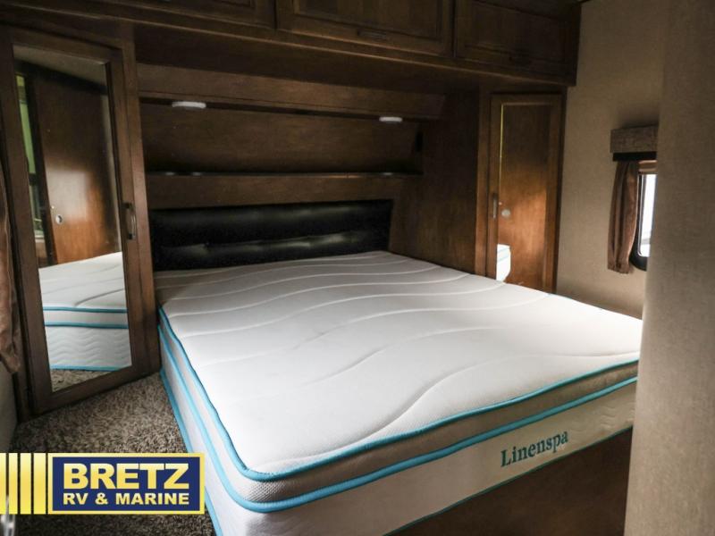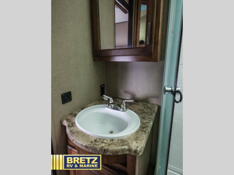 Enjoy the entertainment center with fireplace beneath a 32" TV along the exterior angled bathroom wall. There is also a center kitchen island with a large sink, plenty of counter space, and storage. A hutch is next to the kitchen slide providing a space to display your decor and store more dishes.
