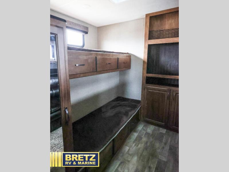 In the rear of this Reflection unit find a private bunkhouse with a slide out tri-fold sofa with a flip bunk above along the road side. On the opposite side there is a set of bunk beds with drawer storage below. The bunkhouse also features an entertainment center, TV prep, and a wardrobe.