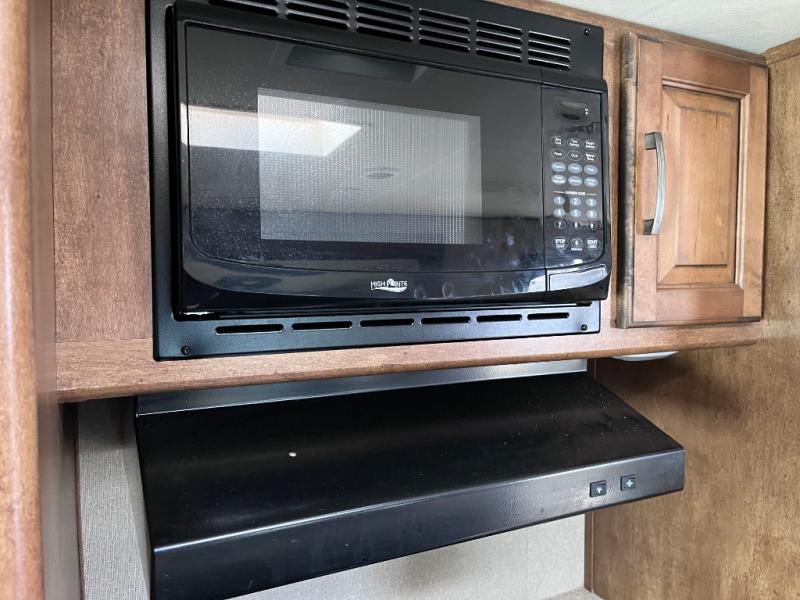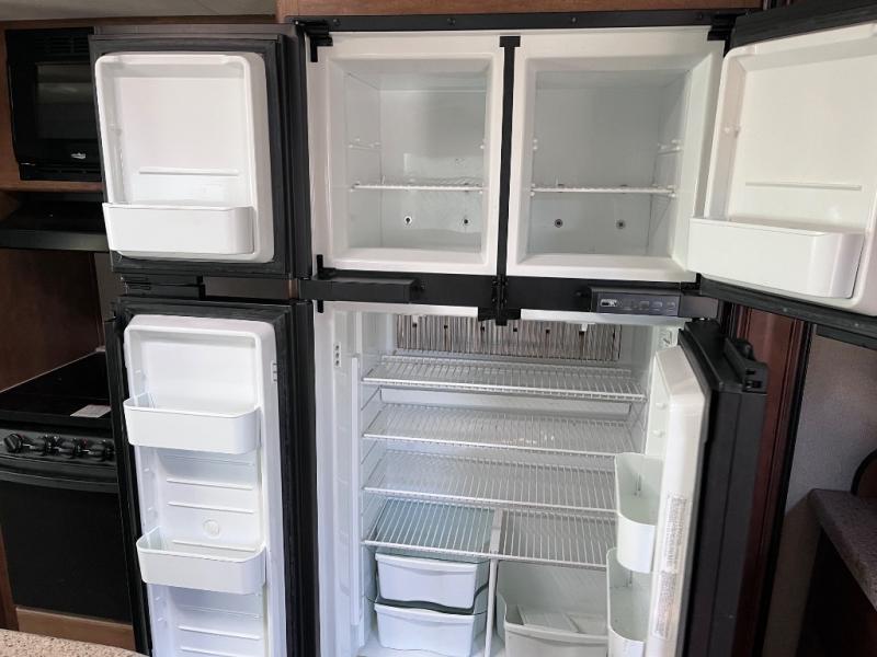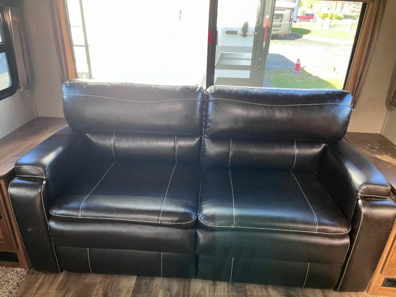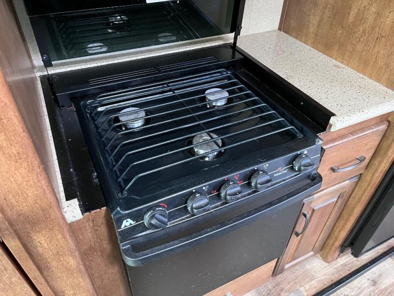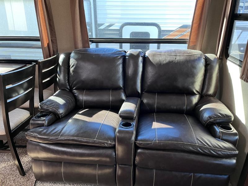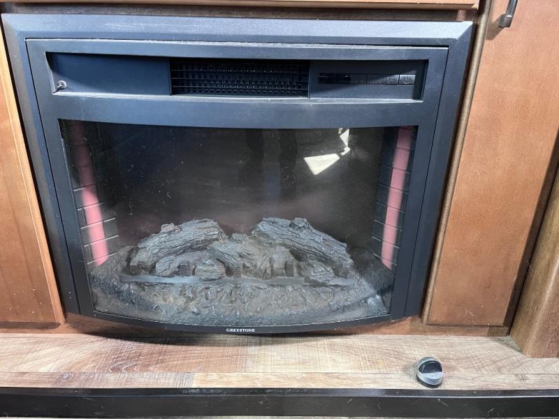 As you enter you will find a combined kitchen and living room with dual opposing slides. The slide to your left features a dinette (with free standing table and chairs option shown), and theater seats for two including cup holders. Along the rear wall adjacent to the theater seats you will find a tri-fold sofa with storage overhead for plenty of seating and added sleeping space for overnight guests. A nearby entertainment center with a 40" TV and fireplace are found in the slide along the road side that also contains the kitchen appliances.