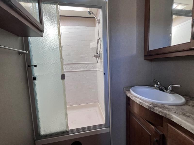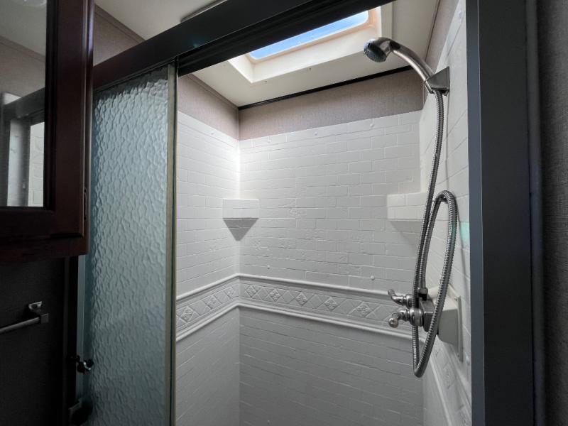 Conveniently located near the main entry door find a side aisle bath with 30" x 36" shower including a skylight, toilet, and a vanity with sink. There is also a linen cabinet for your towels and toiletries.