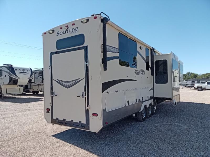 You can easily take along a few toys in this Solitude fifth wheel toy hauler model 374TH which features a rear ramp door that leads to a garage storage area beneath the bedroom that is 63" wide x 111" deep, and 66" high. You will also enjoy all of the added interior space thanks to five slide outs throughout. Additional great features include a spacious kitchen with a convenient center island, and a front entertaining space with a telescoping TV including a fireplace as well!