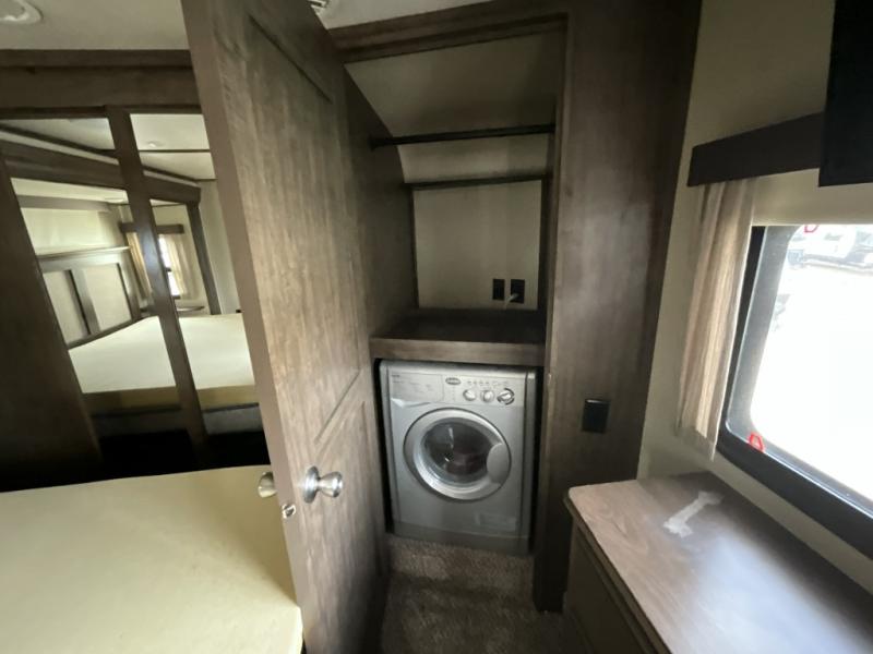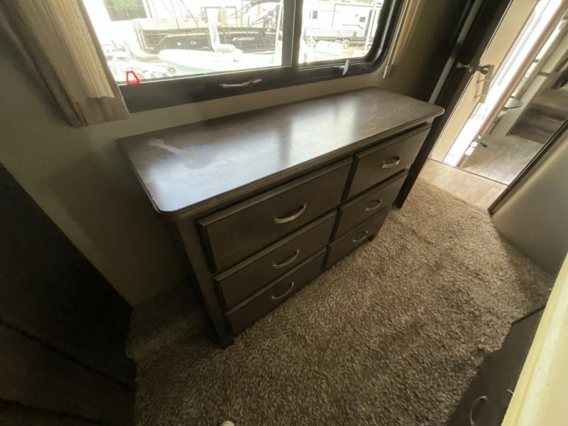 You can also enter the front bedroom from the hallway door. Here you will find a slide out dresser and LED TV on your right. Opposite enjoy sleeping on a slide out KING size bed with pullout ottoman off the foot of the bed, and a full front closet with shirt storage. It is also prepped for a washer and dryer if you choose to add the units.