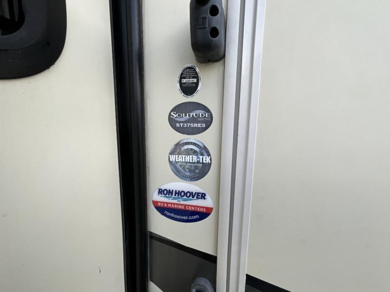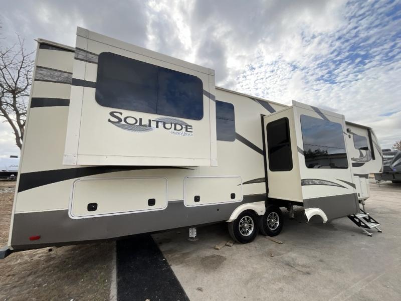 Enjoy camping in this Solitude fifth wheel model 384GK by Grand Design. This model features a rear living layout, four slides for added space inside, and a private front bedroom with a KING size bed, and more!