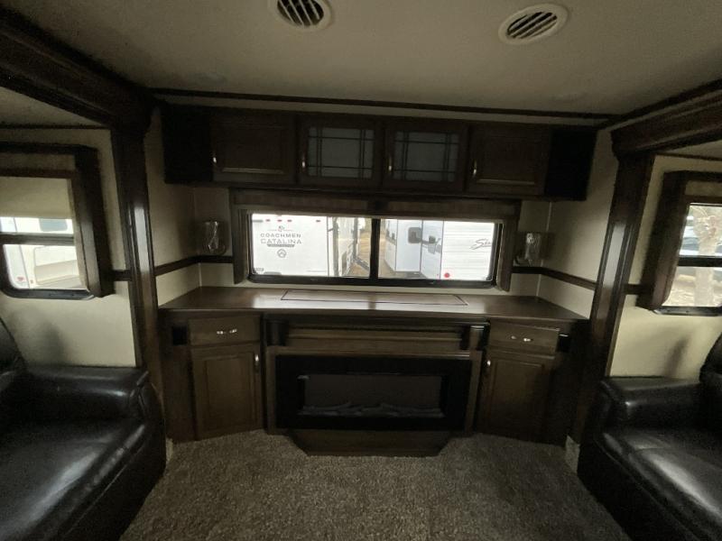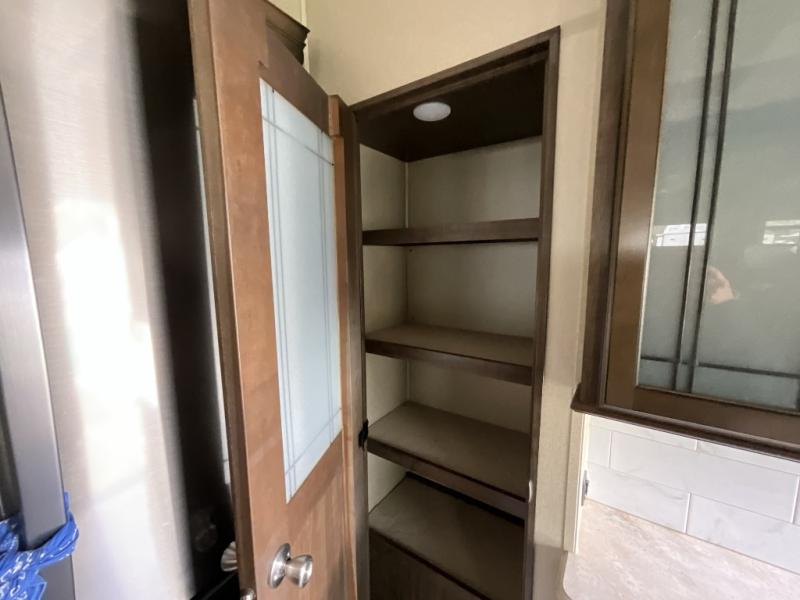 The slide opposite the door side features an entertainment center with a LED TV and fireplace. There is also a three burner range and microwave for cooking with counter space on either side, plus an 18 cu. ft refrigerator for your perishables within the slide out. There are two handy pull-out trash cans as well. Along the interior wall find a pantry, and a desk with overhead storage. And don't forget about the kitchen island with double sinks, extra counter space and storage, plus a space for an optional dishwasher.
