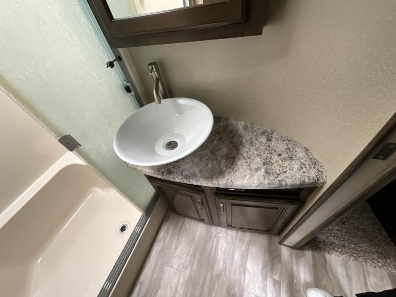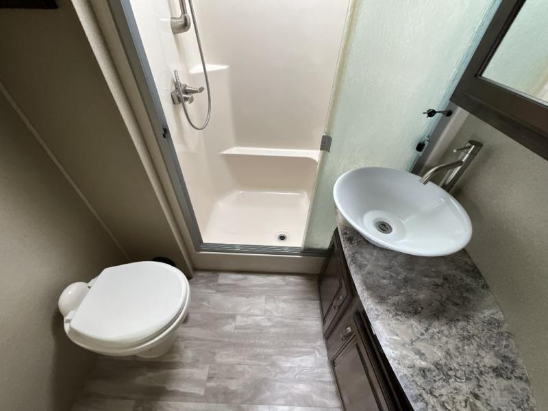 Head up the steps to a front bedroom and bath. The bath offers a large shower with seat and skylight, plus a toilet and linen cabinet. There is also a slide out vanity with sink and medicine cabinet which is attached to the bedroom slide out giving you much added space. A second bath entry door slides to provide easy access to the bedroom.