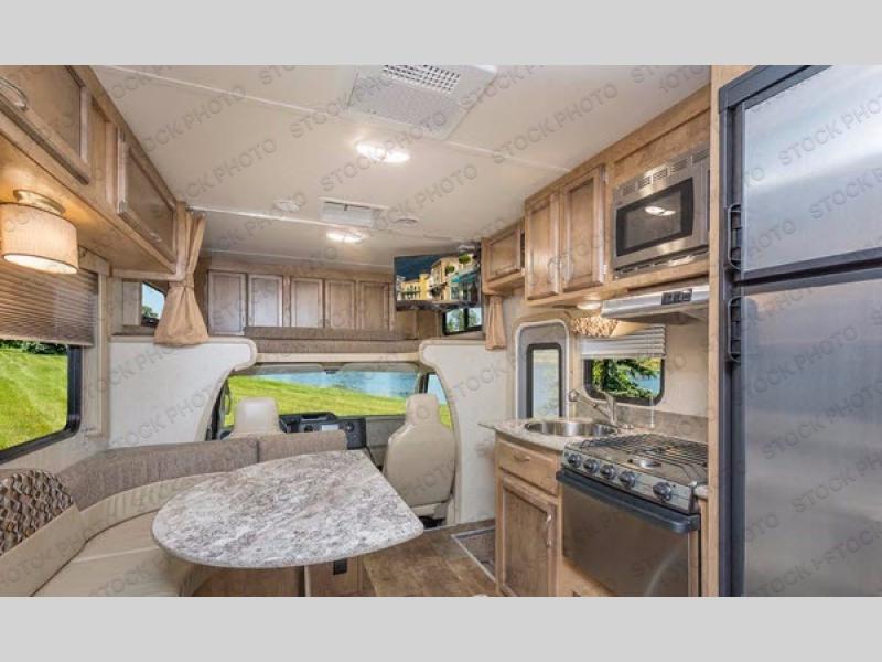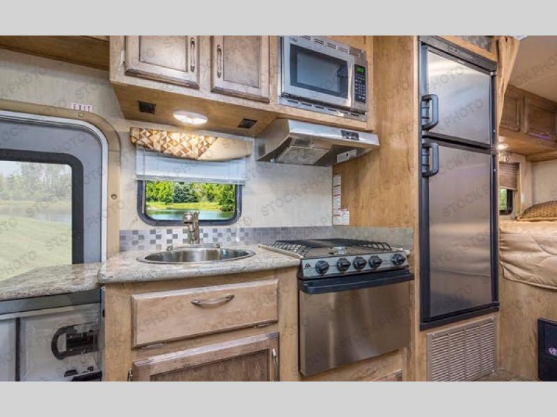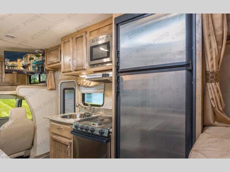 To the left of the side entry door you will find a round single sink with flip up counter extension, a three burner range, overhead microwave oven, storage, and a stainless steel refrigerator for your perishables.