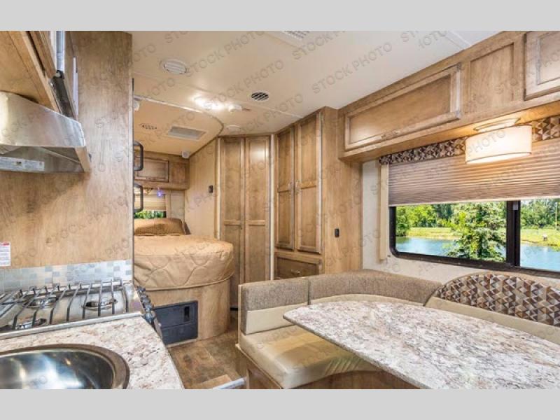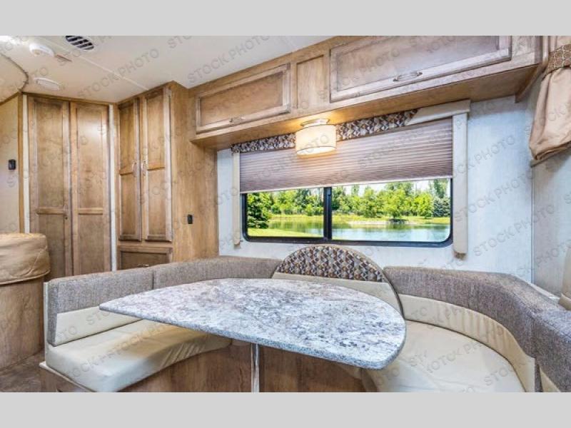 A nice u-shaped dinette allows space enough for everyone, plus storage, and sleeping space as well.