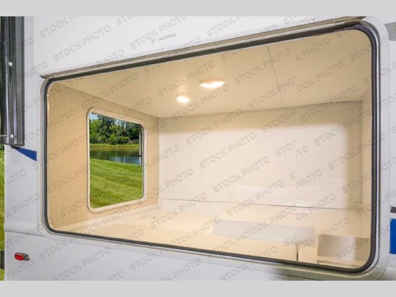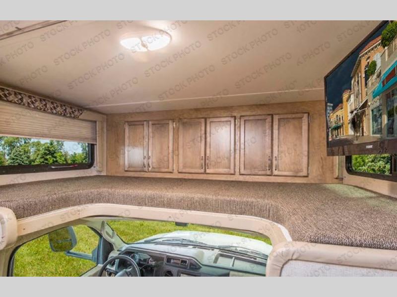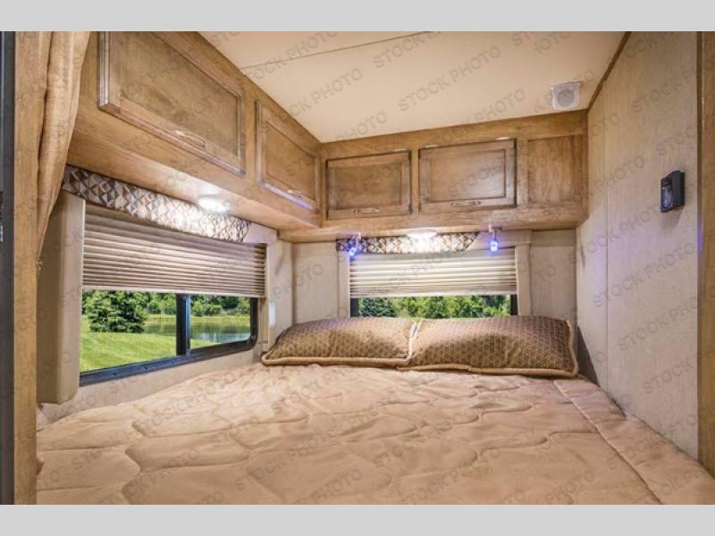 Heading inside you will also find ample storage with overhead cabinets throughout. There is a bunk above the cab area with a TV mount, plus storage and cabinets across the entire front for your things.