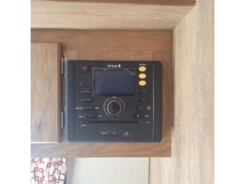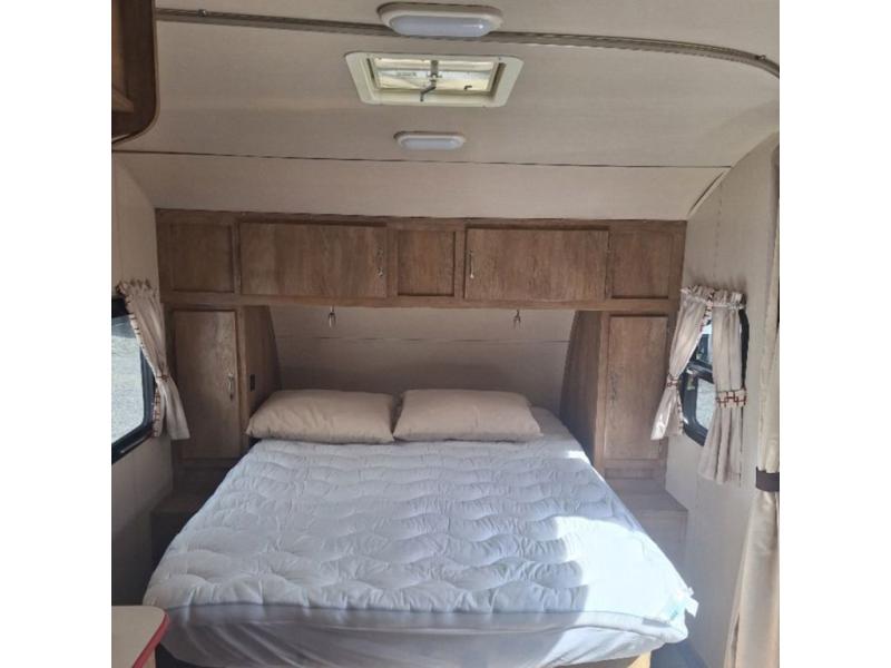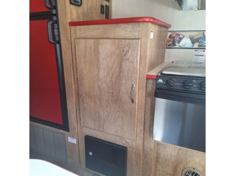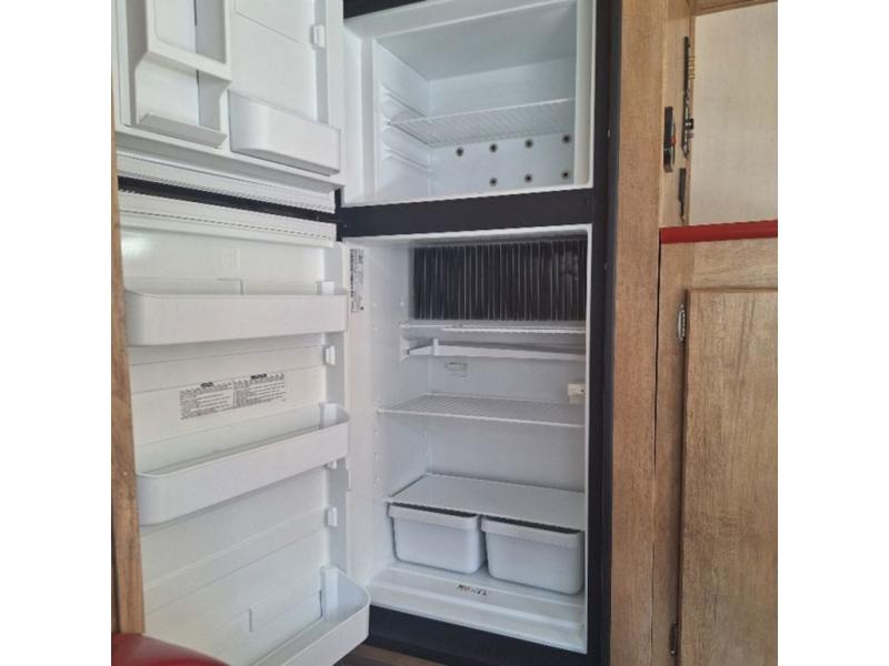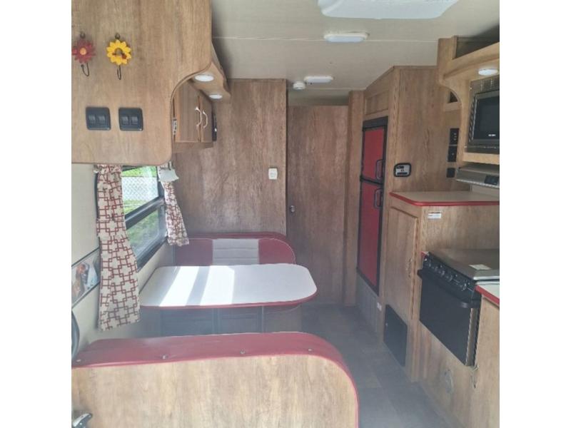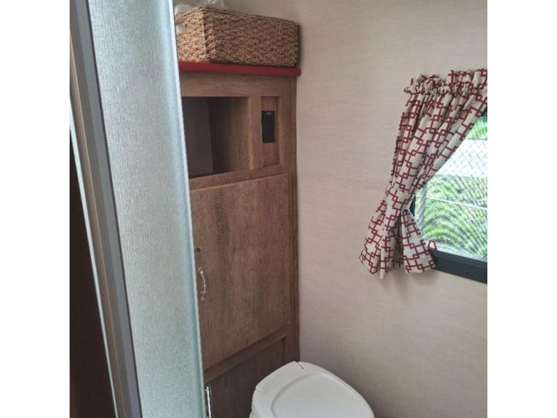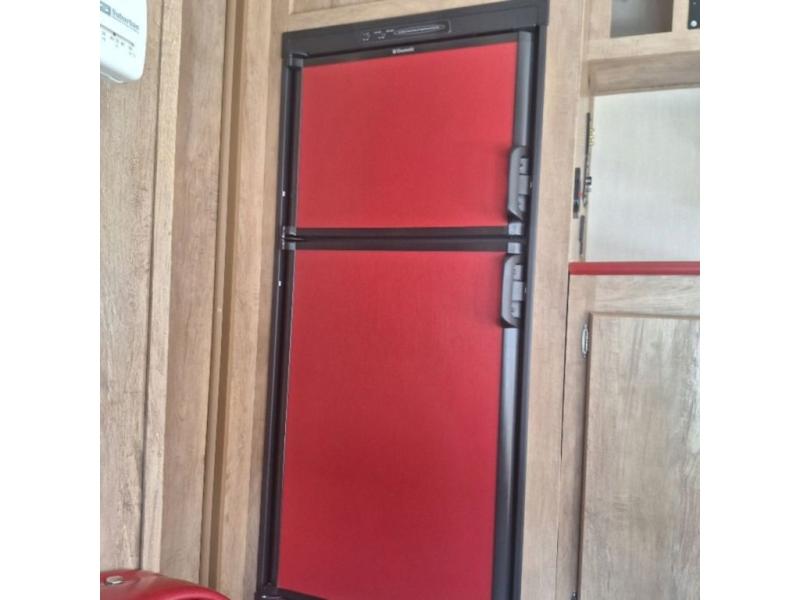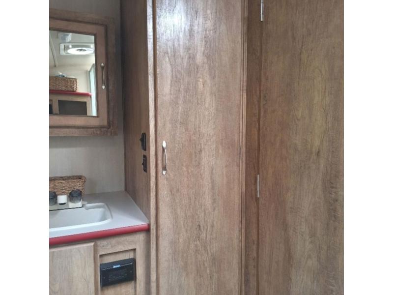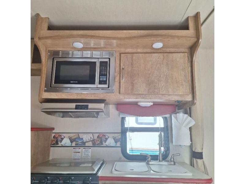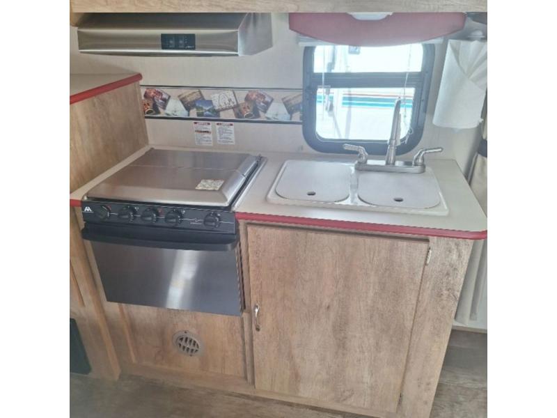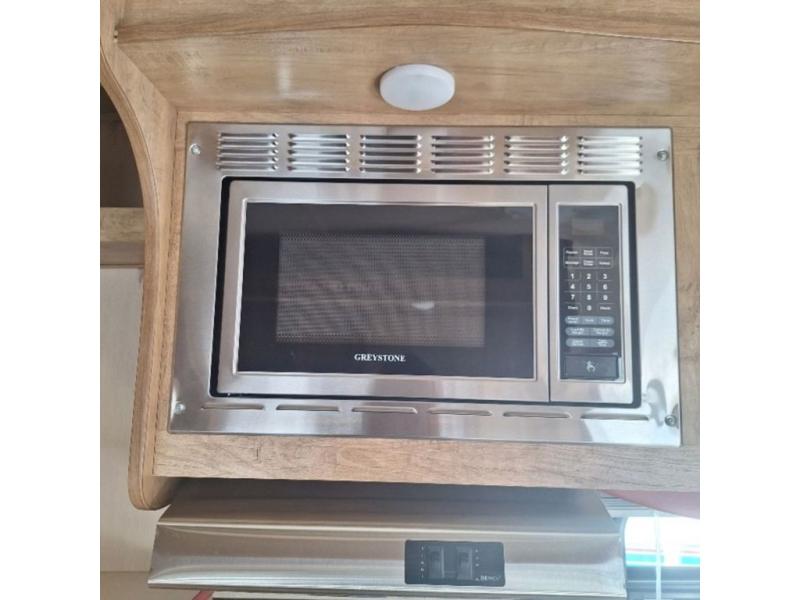 The kitchen amenities allow you to easily create meals and snacks while you travel. There is a double kitchen sink, a two burner cook-top, a microwave oven, and refrigerator for all of your perishable goods.