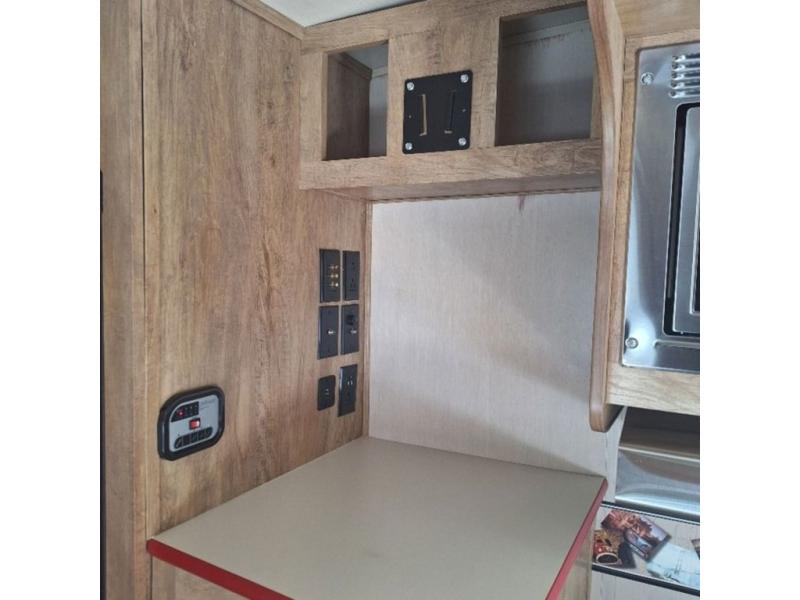 To the left of the door you will find a booth dinette that also includes storage overhead. This is the perfect place to enjoy your meals and snacks, or when playing boards games or just hanging out. It can also be converted quickly to additional sleeping space for one more family member or overnight guest. There is a TV mount along the opposite wall which would make it easy to view if you added an optional flat screen TV.