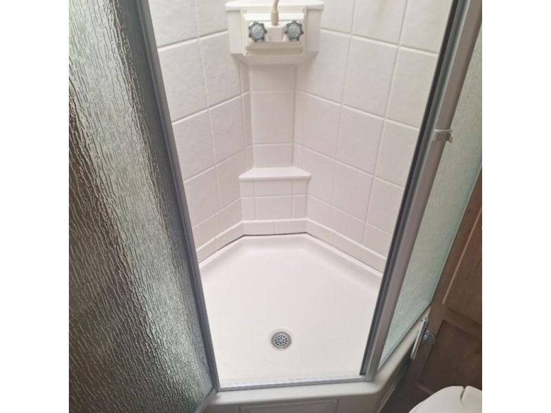 The rear of this unit offers a spacious bath including an angled shower, a toilet with linen storage overhead, plus a large vanity with sink, and so much more!