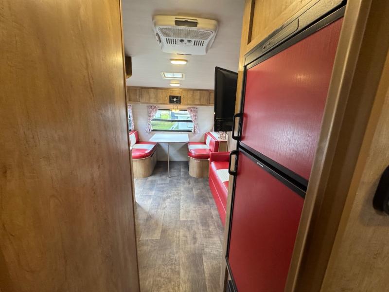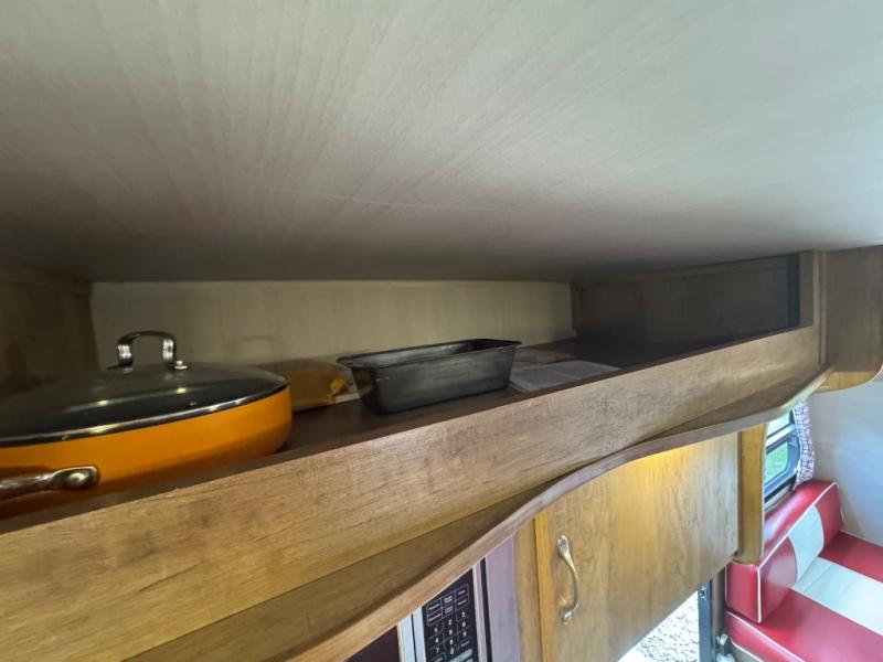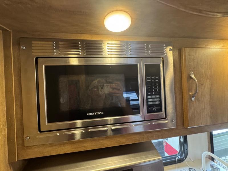 The kitchen amenities allow you to easily create meals and snacks while you travel. There is a double kitchen sink, a two burner cook-top with overhead microwave oven, and cabinets for your dishes and things. There is also a refrigerator along the road side for your perishables.