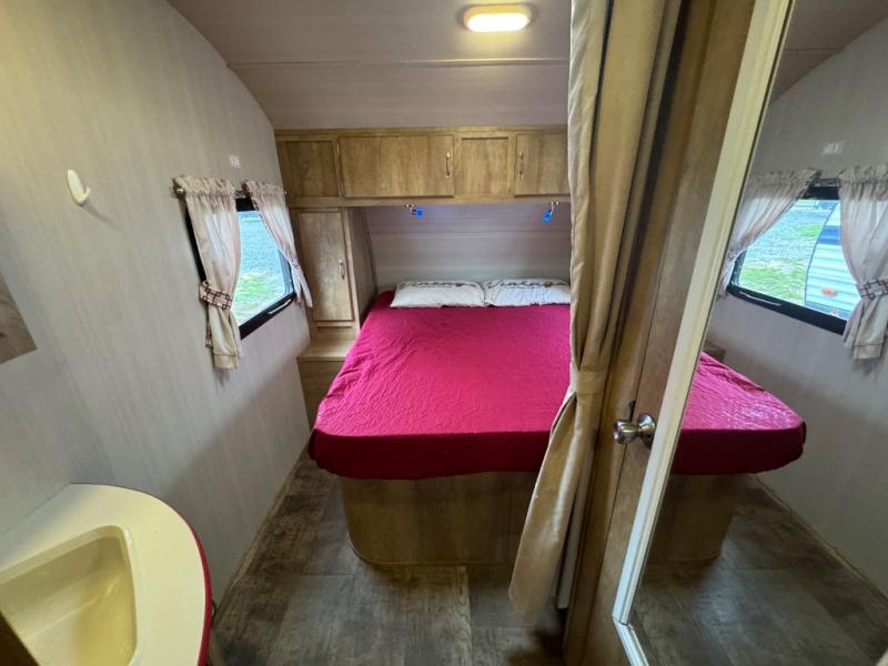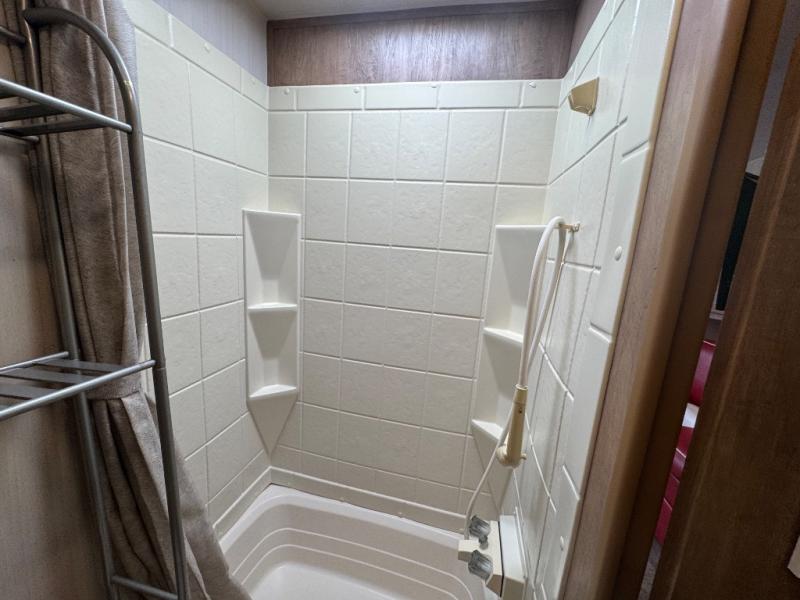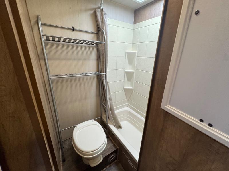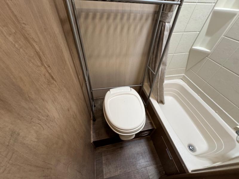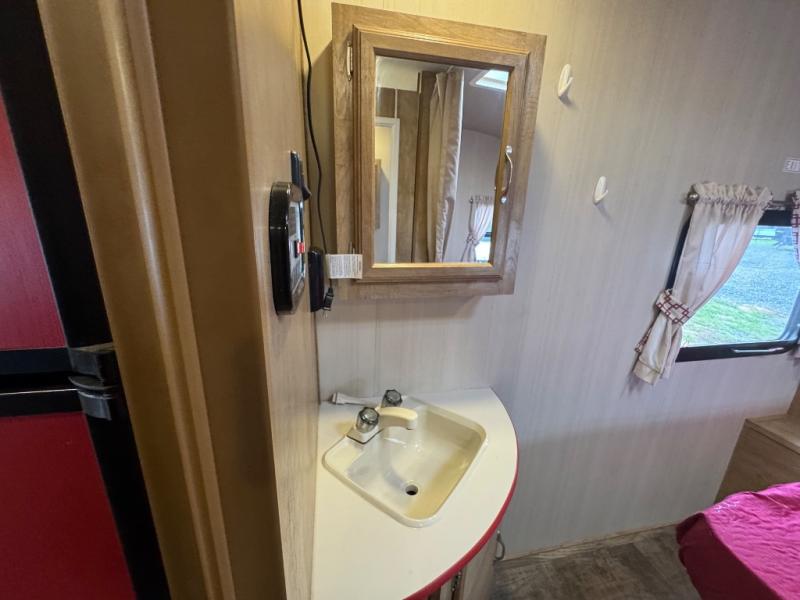 In the very front of the trailer you will find a private tub/shower and toilet. The bath sink can be found opposite, on the front facing side of the refrigerator.