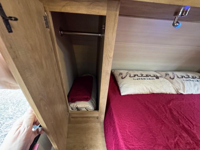 The bedroom area features a queen size bed, dual bedside shirt closets, and overhead cabinets for your things. There is also a curtain that can be pulled when you would like a bit more privacy.