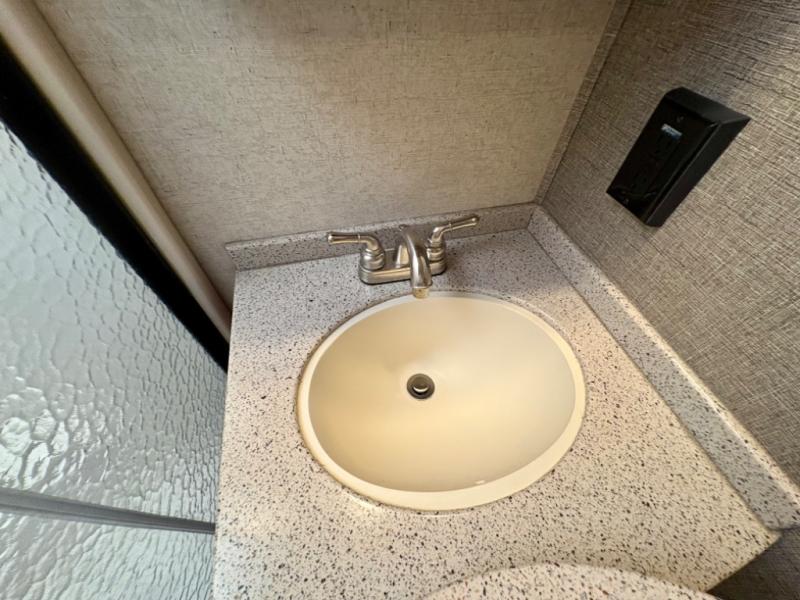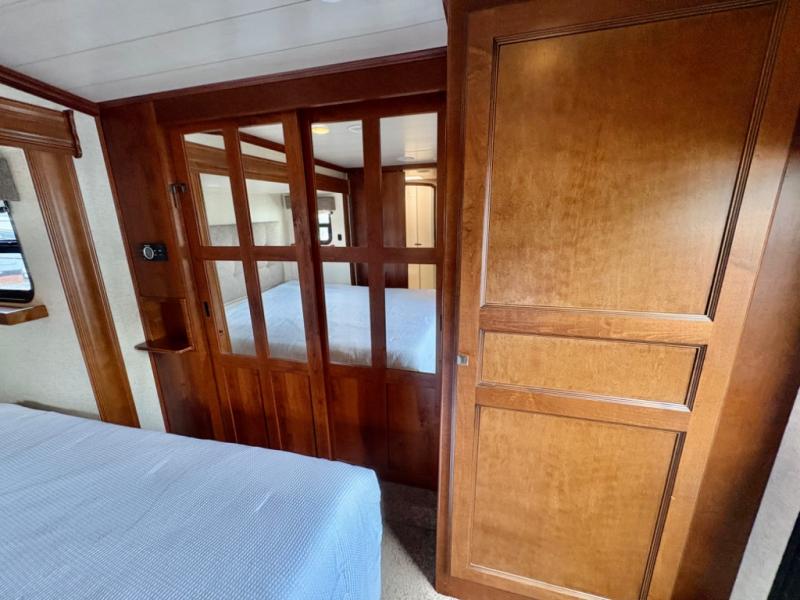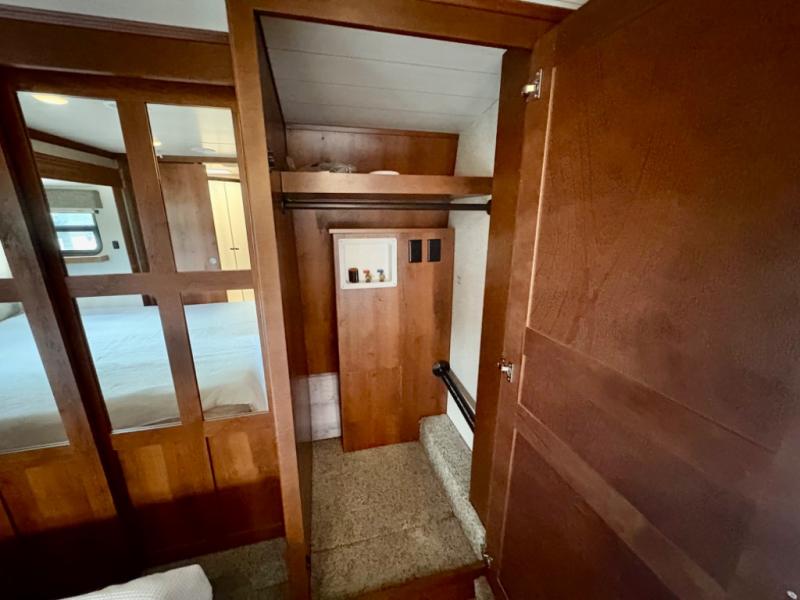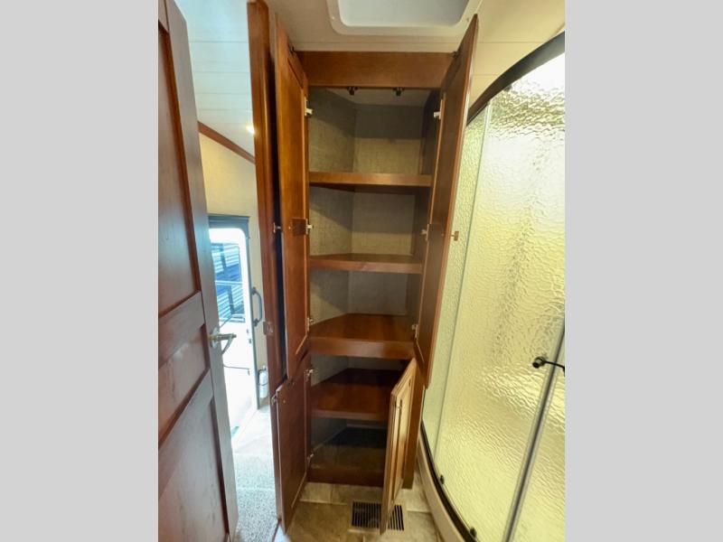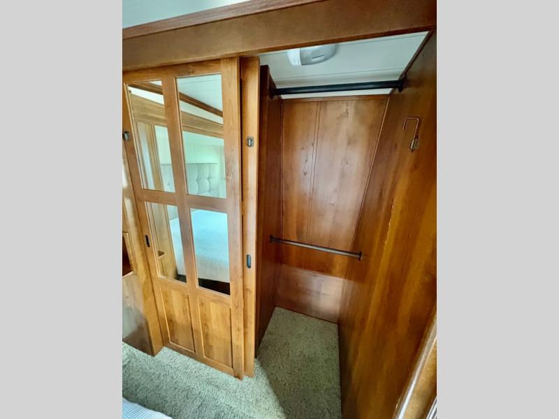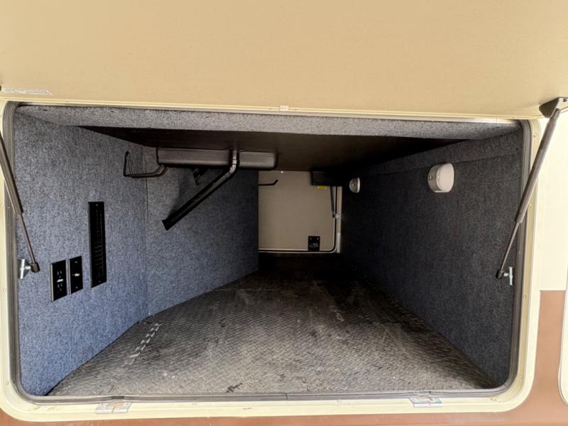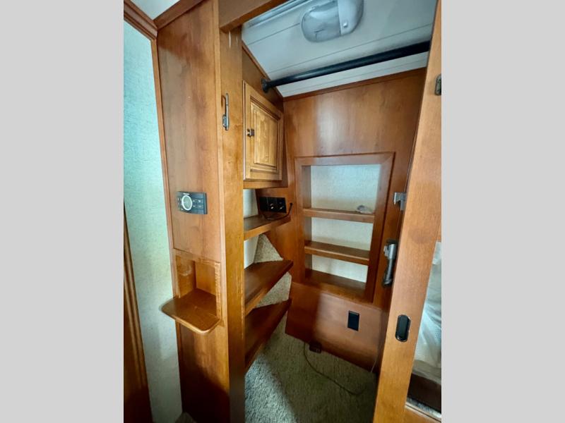 The front of this Bighorn model is where you can relax and unwind on a king bed slide out. Here you can enjoy a great night's sleep. There is a dresser opposite the bed, along with a front closet for hanging clothes which also features drawer space inside along the road side wall. There is also a corner closet that has been prepped for a washer and dryer if you choose to add for more convenience, plus so much more!
