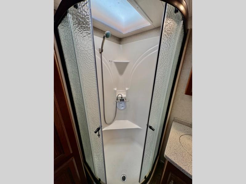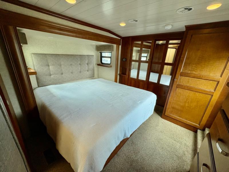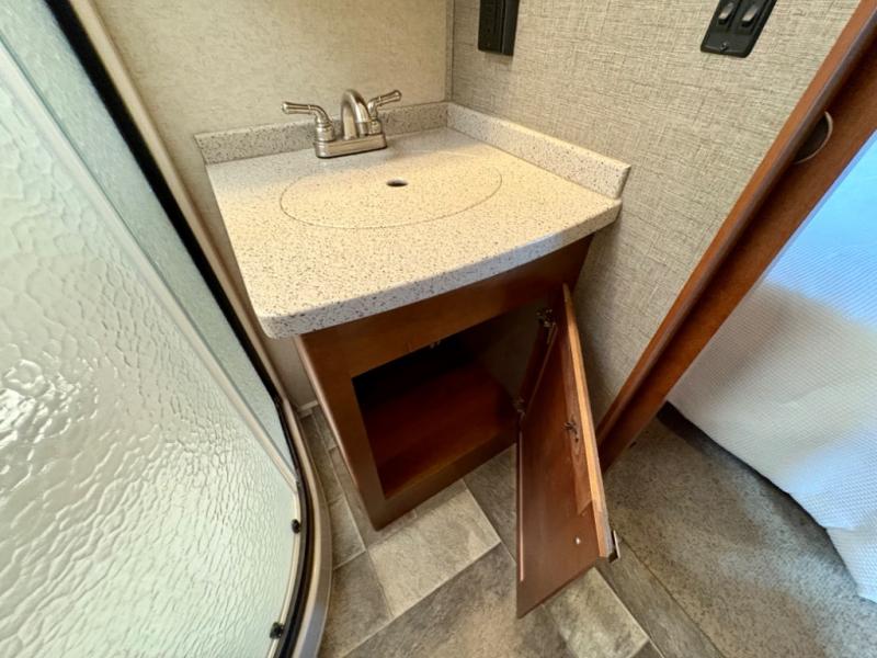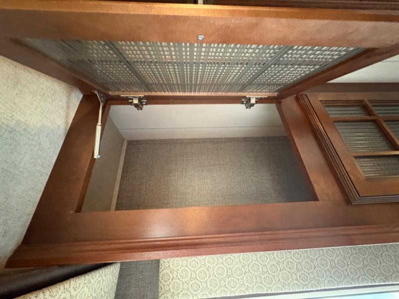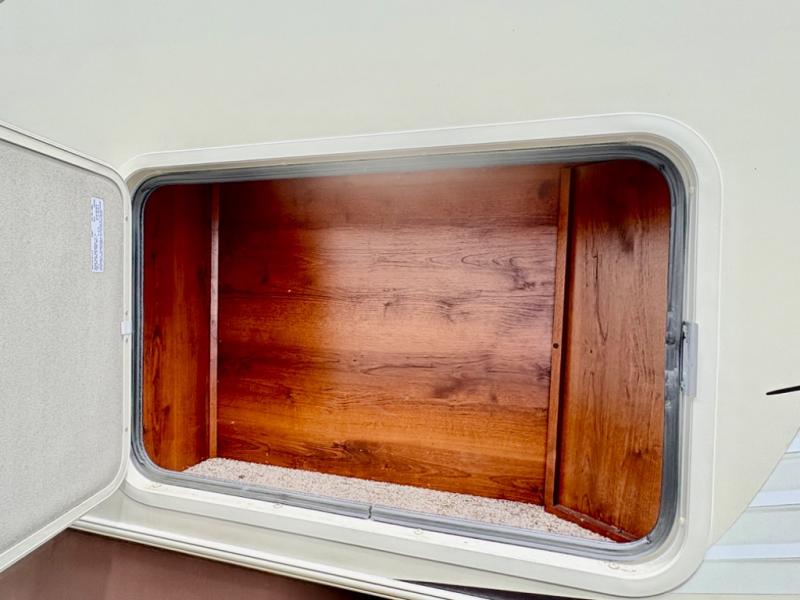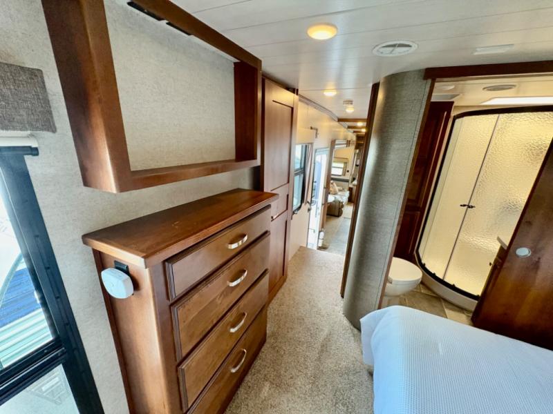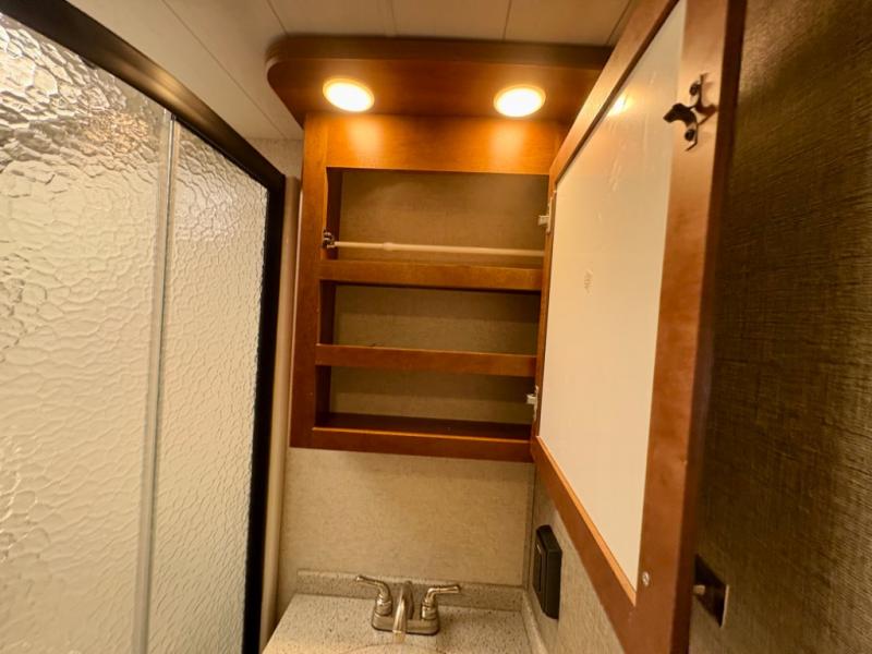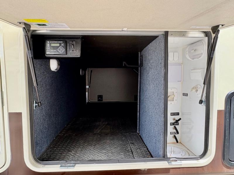 The front of this Bighorn model is where you can relax and unwind on a king bed slide out. Here you can enjoy a great night's sleep. There is a dresser opposite the bed, along with a front closet for hanging clothes which also features drawer space inside along the road side wall. There is also a corner closet that has been prepped for a washer and dryer if you choose to add for more convenience, plus so much more!