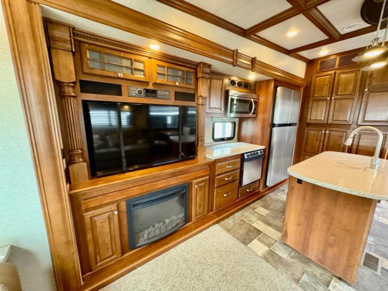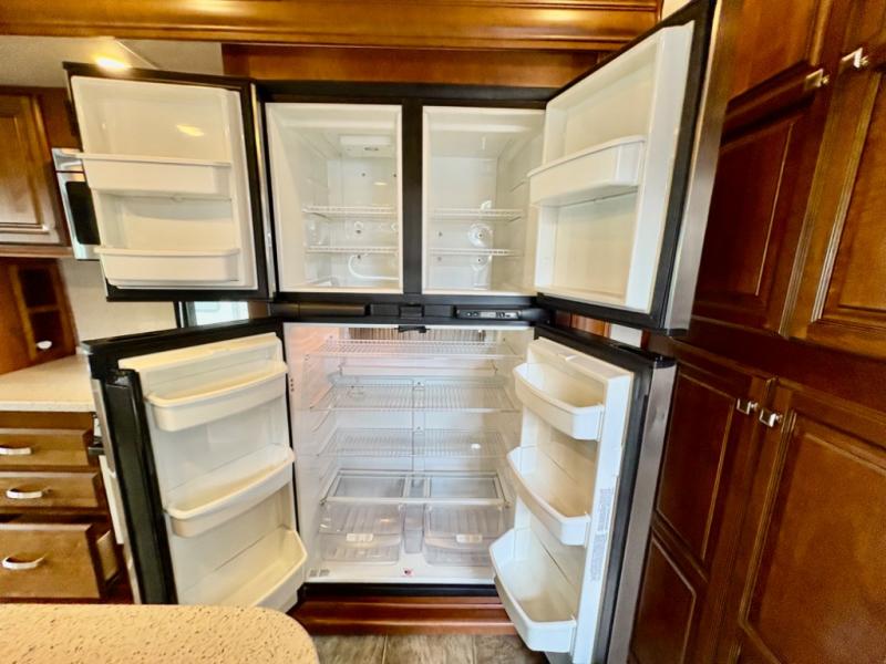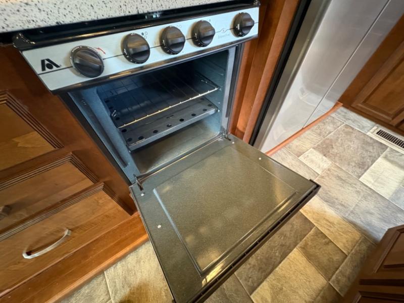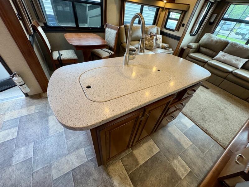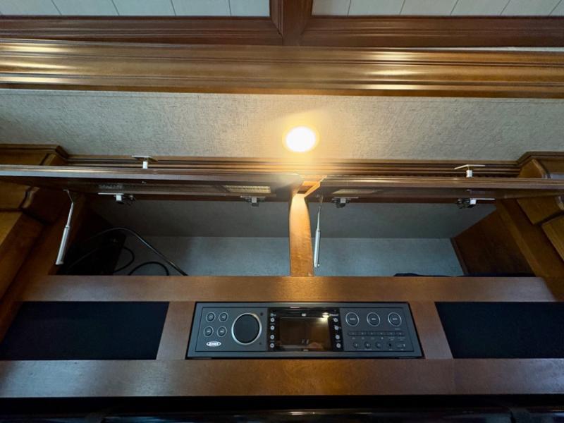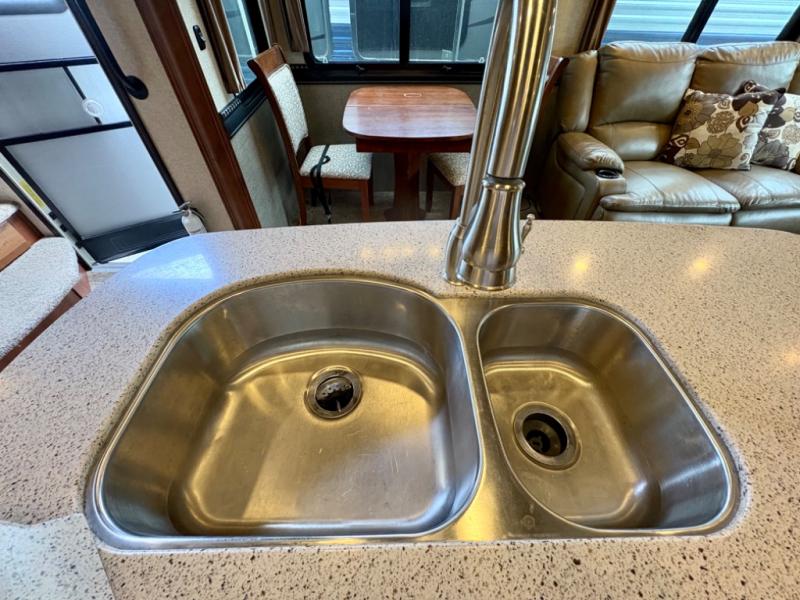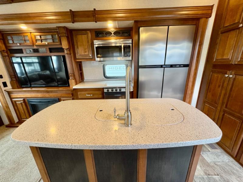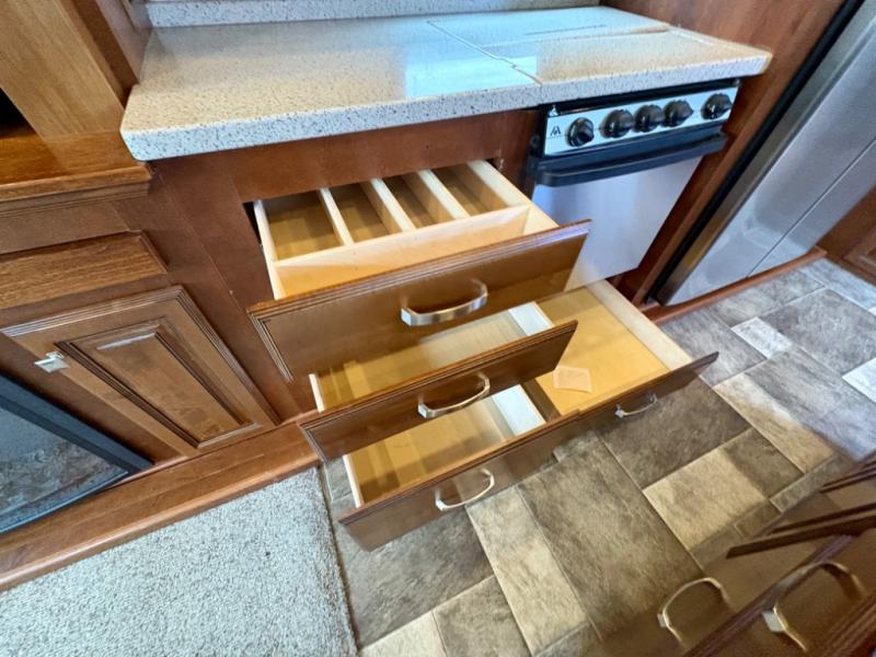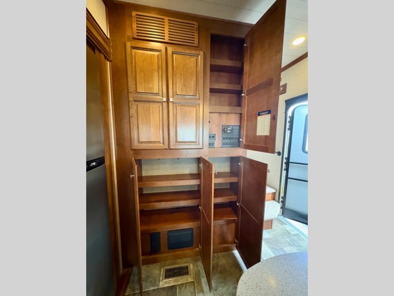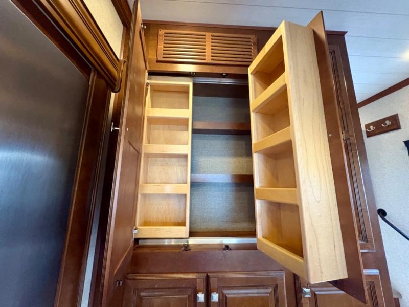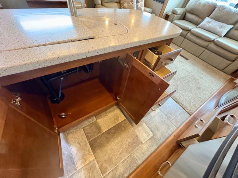 The slide opposite the door side provides an entertainment center with pull-out desk, some counter space, and a range next to a double door refrigerator. The double sink can be found in the nearby kitchen island which also provides added storage and more counter-top prep space. There is a floor to ceiling storage pantry along the interior wall straight in from the door.