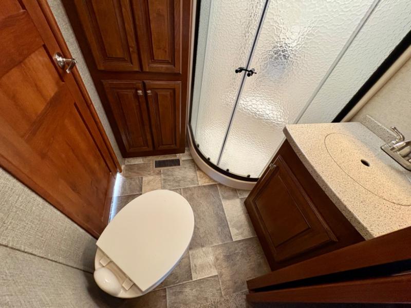 Head up the steps on your right as you enter and find a side aisle bath at the top left. Inside the bath enjoy a corner shower, toilet and sink with medicine cabinet overhead, plus linen storage too.