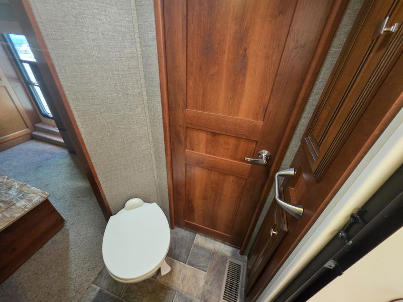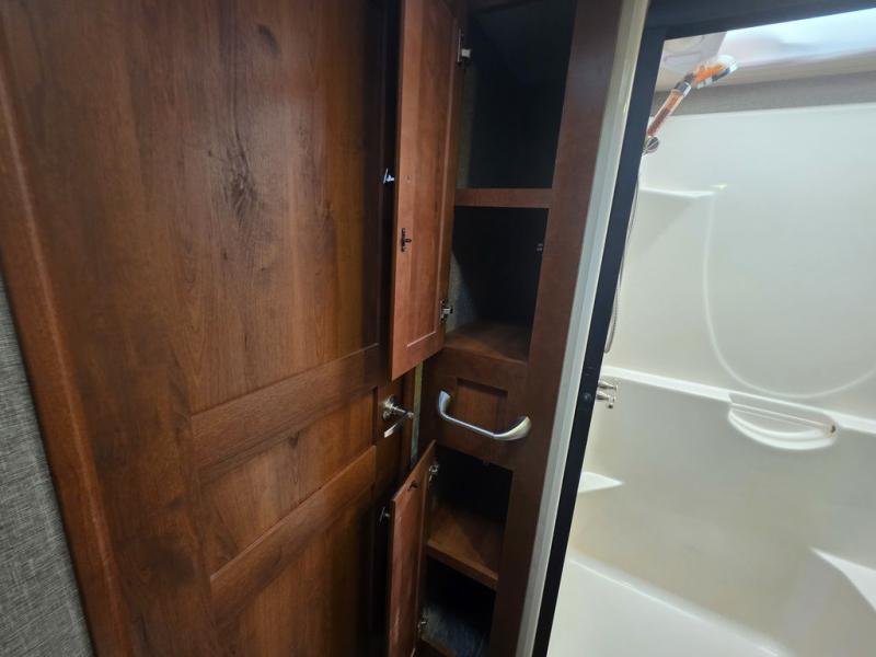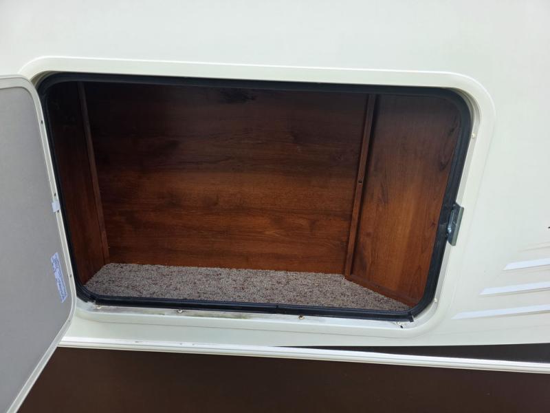 Head up the steps to the right of the main entry door and find a complete bath with shower including a seat, and a vanity with sink. There is also storage for linens and a toilet. There is a second sliding door in the bath that leads right into the front master bedroom where you will find a comfortable king size bed slide out, a dresser opposite along the curb side wall, and a front wall closet with sliding doors. For added convenience there is a washer/dryer prepped space so you can easily add the appliances, and so much more!