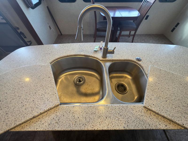 Step in and see how comfortable your next camping trip would be. There is a dining table for two within a slide out that also contains two swivel glider recliners as well. Along the rear wall find more seating with a sofa including end tables on either side. Adjacent to the sofa enjoy a slide out entertainment center with LED TV, along with a pull-out desk, plus overhead storage. This slide also features the kitchen appliances which includes a double door refrigerator and a three burner range. There is also a kitchen island with double sink, and added counter space along the interior wall.