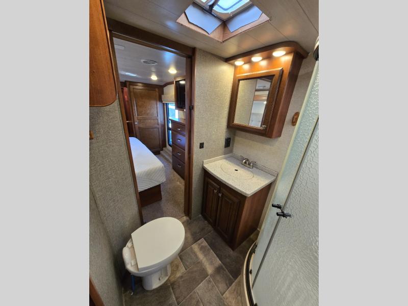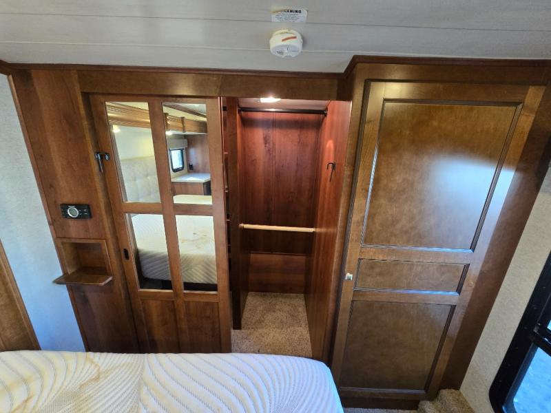 There is a handy closet just inside the door on your right before you head up the stairs to the front bedroom and bath. As you get to the top step you will notice hall storage on the left that is part of the bedroom slide out which also features a nice size nightstand, and a king size bed.