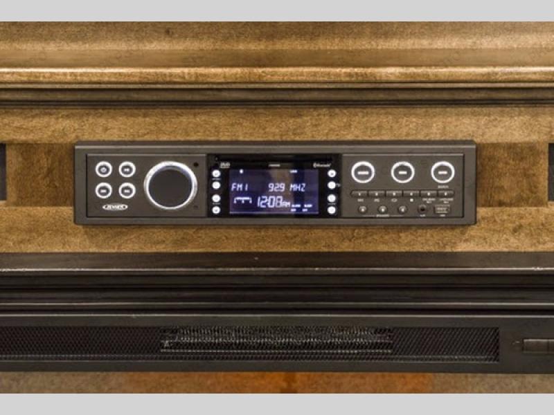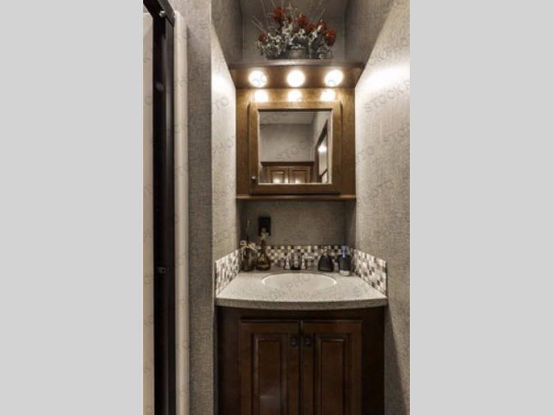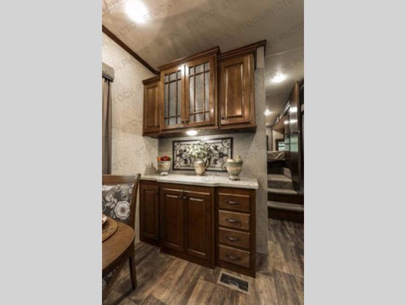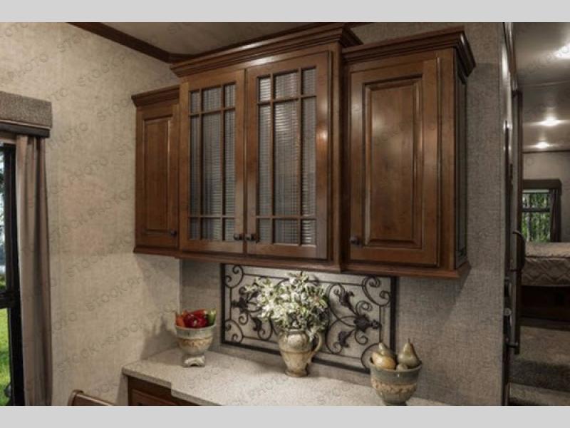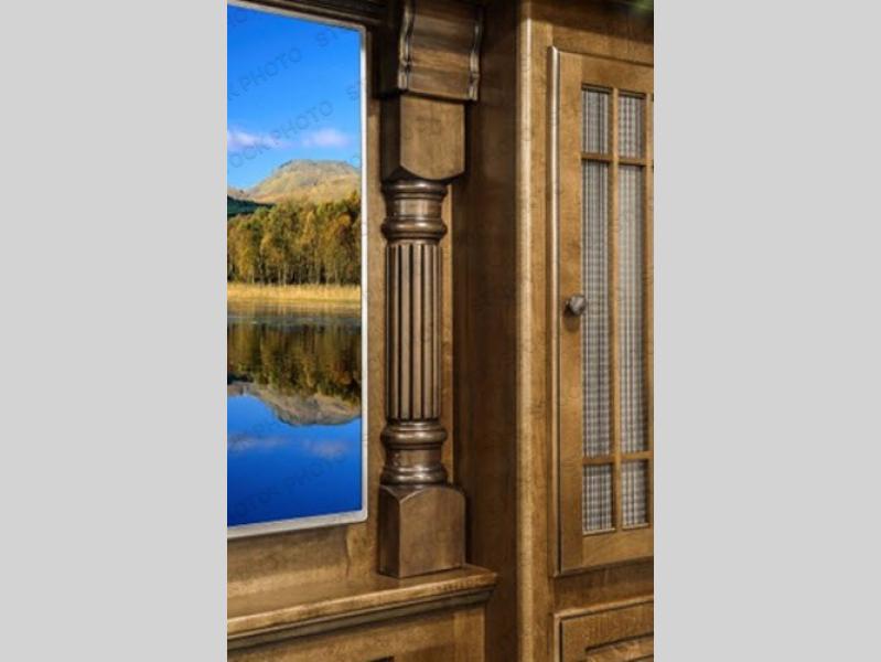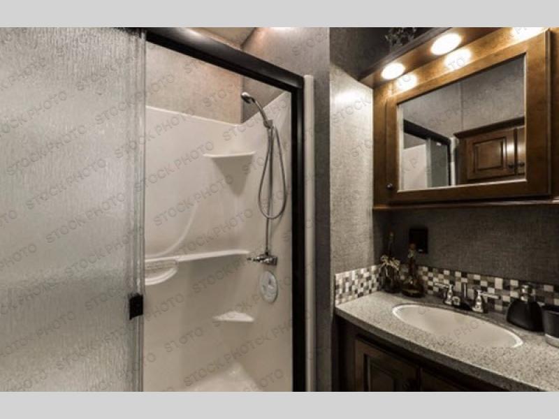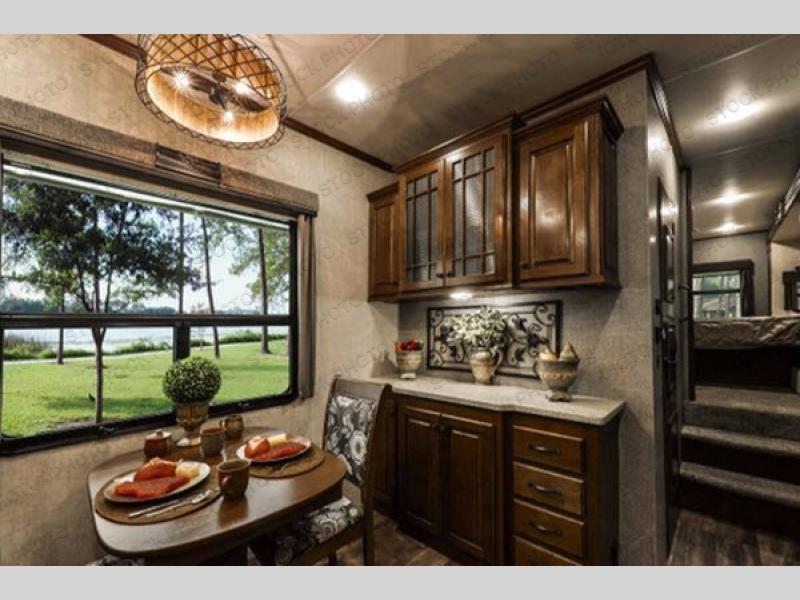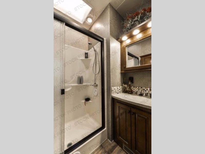 What I liked most: The bedroom is very spacious feeling, this is probably because the bedroom alone has 2 slides. The shower has good height and a very cool designed 3 panel door. The elevated living room area feels like it's own separate room. Glass cabinets throughout look great as well.