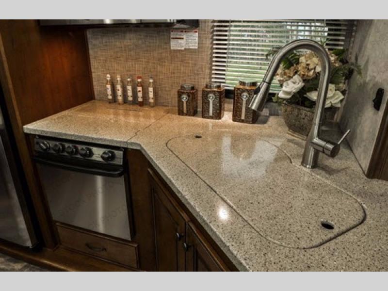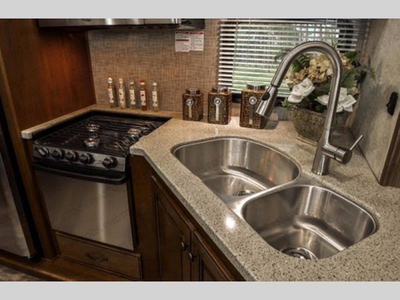 Back on the main level in the kitchen area as you enter you will find a dinette for two to the left of the door along with a counter top including storage both above and below. Opposite the door side find a slide out double door refrigerator, a three burner range, plus double sink, and overhead storage. There is also storage space along the interior of the kitchen where the front living and kitchen meet just below the reclining theater seats.