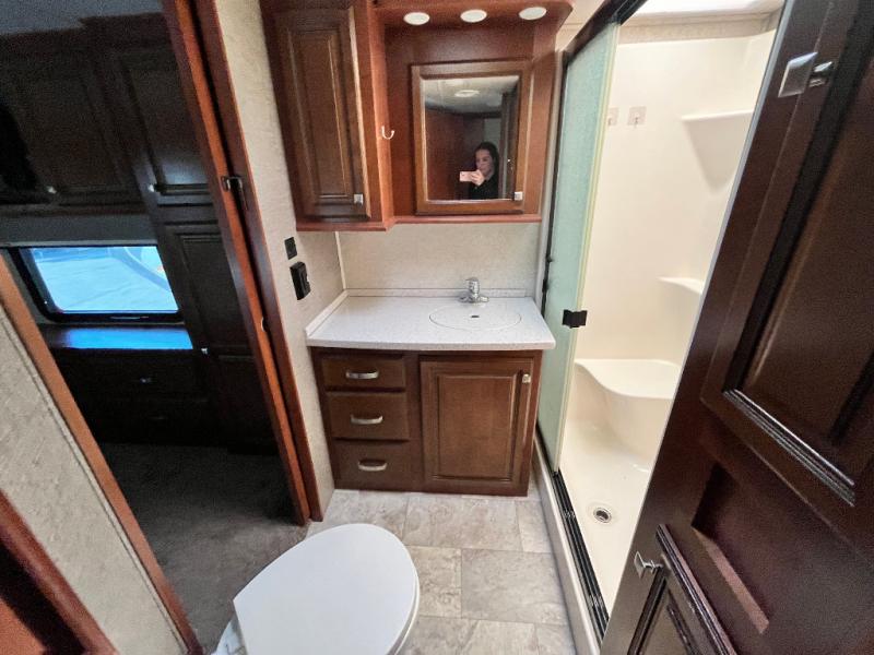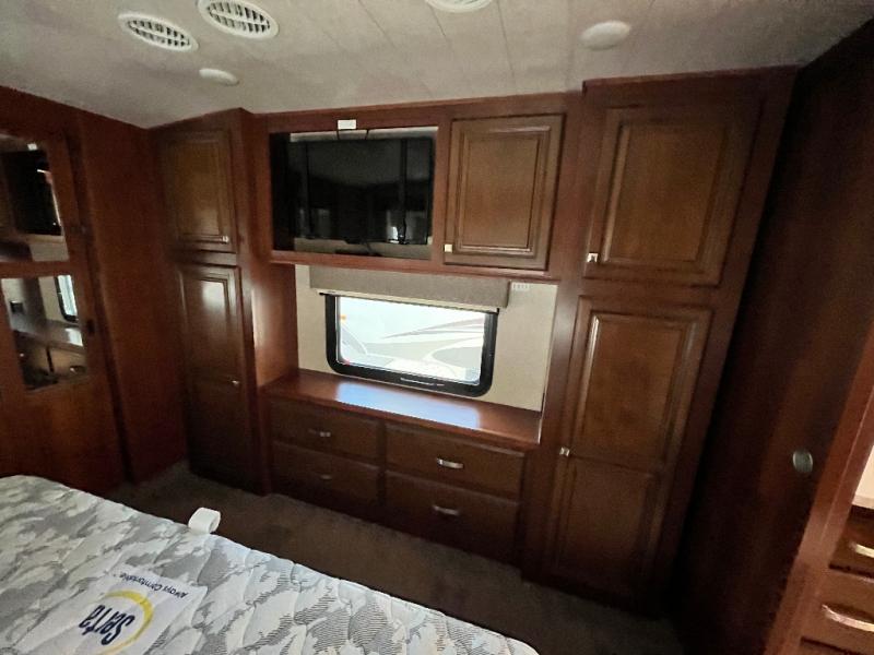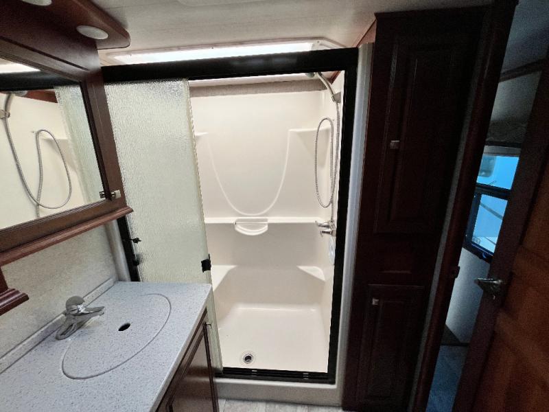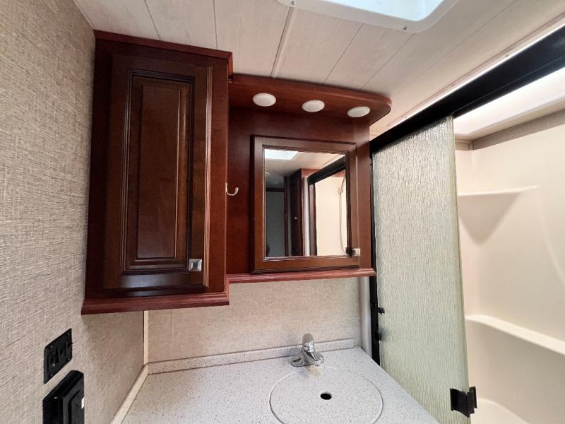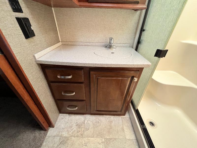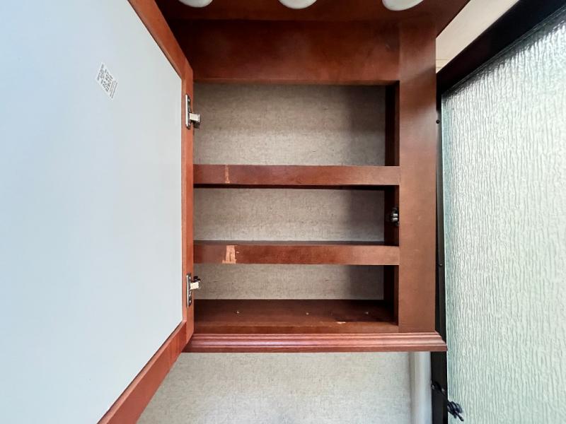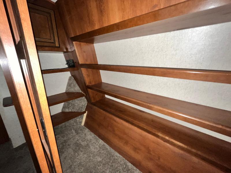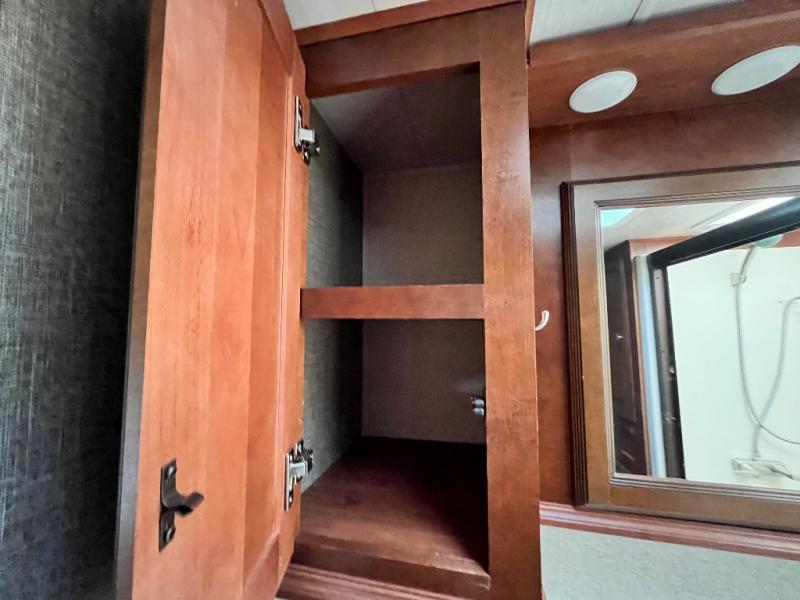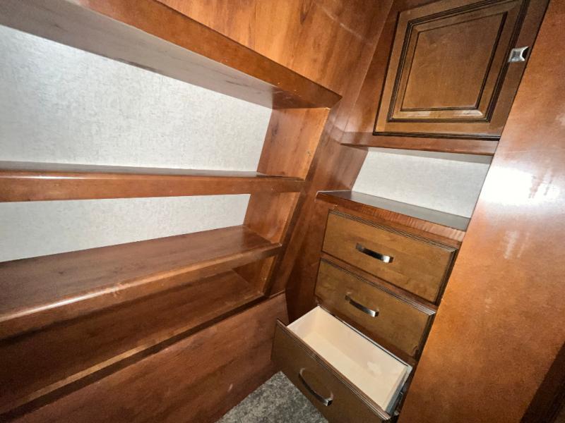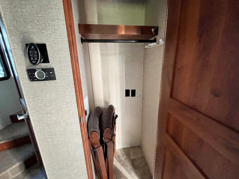 Once inside the bedroom which can be accessed from the hall or from within the bathroom you will find a spacious retreat to catch up on some sleep so you are ready for the next adventure. There is a king bed slide, and one nightstand within the slide. The slide also provides more walking around space inside the room. Opposite the bed is a dresser with two tall storage cabinets on either side. The front wall features a full wall wardrobe for your hanging clothes with storage drawers on each end, plus so much more!
