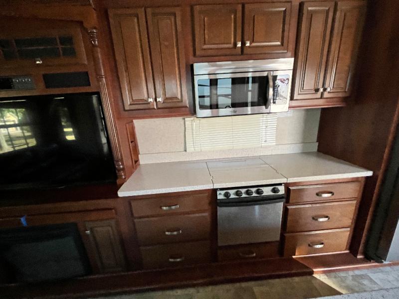 The slide opposite the door begins near the sofa with an entertainment center which includes a pull-out desk area for a laptop, and a large LED TV. This slide also contains counter space, a three burner range, and refrigerator, plus plenty of overhead storage.