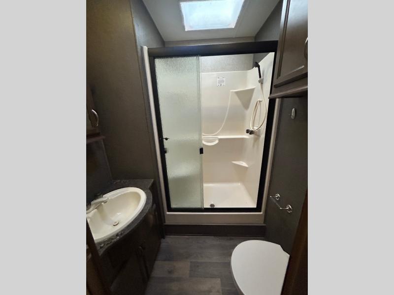 Heading towards the rear, the bathroom is on the right. Inside the bathroom find a sink, medicine cabinet, shower with seat, toilet, and linen cabinet for towels or toiletries.