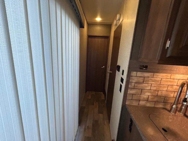 Enter through the patio door and find yourself in the kitchen and living area. Straight in front of you is a double kitchen sink, four burner range, and plenty of overhead cabinet space. A kitchen island provides extra counter space for preparing or serving meals. There are dual opposing slides which help to open up the combined kitchen/living room. One slide includes a refrigerator, pantry, and two lounge chairs along the road side. The opposite slide has a free-standing table and chairs and a sofa. Along the front of the living area there is a large counter area to display your favorite pictures and decor, and overhead cabinets to stow away items.