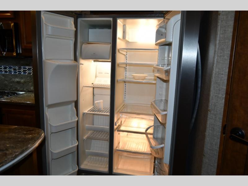 The gourmet kitchen is built for serious cooking on the road. It includes solid-surface countertops, a full-size residential refrigerator, premium appliances, and abundant counter space. The kitchen layout offers both style and functionality, making meal preparation comfortable whether you’re traveling or parked for the season.