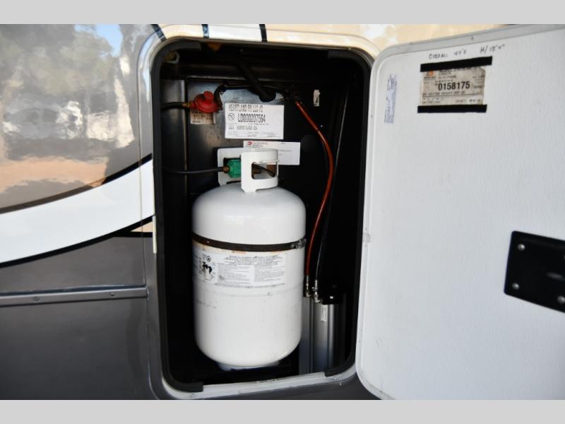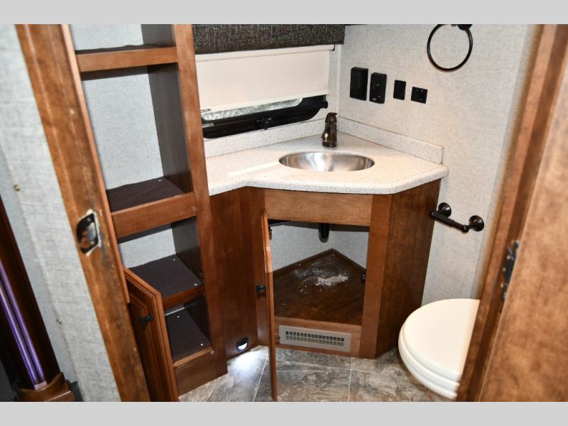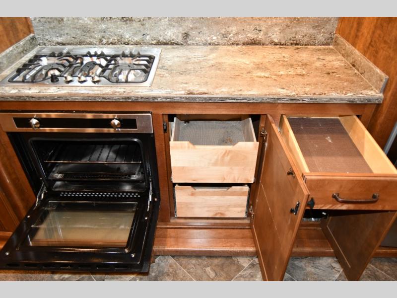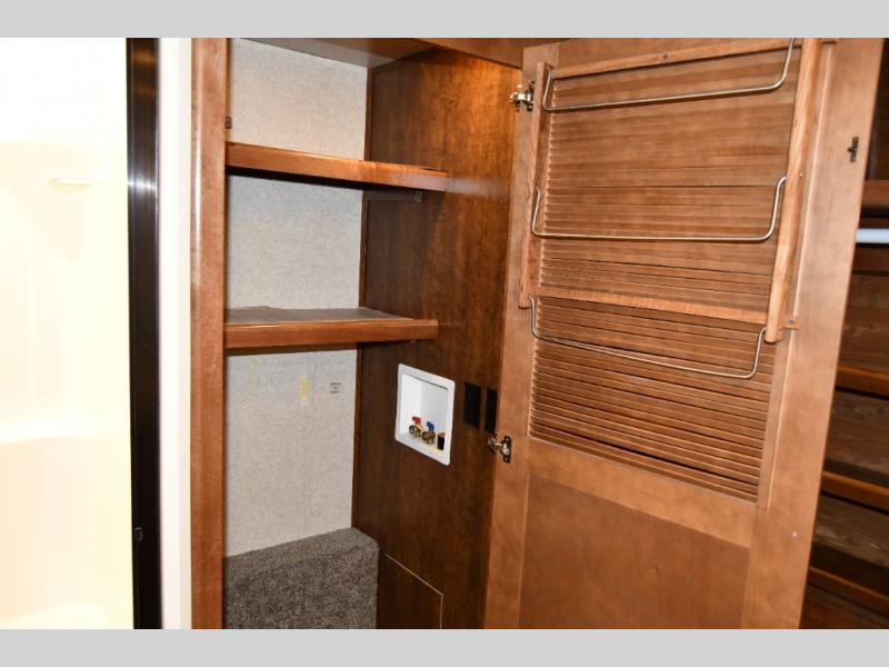 Head up the steps to the right of the entry door and find a bank of storage cabinets for all of your things. A sliding door creates a private retreat in front and the queen bed slides out creating more walking around space to enjoy. There are drawers beneath the foot of the bed to help keep things stowed away and organized.
